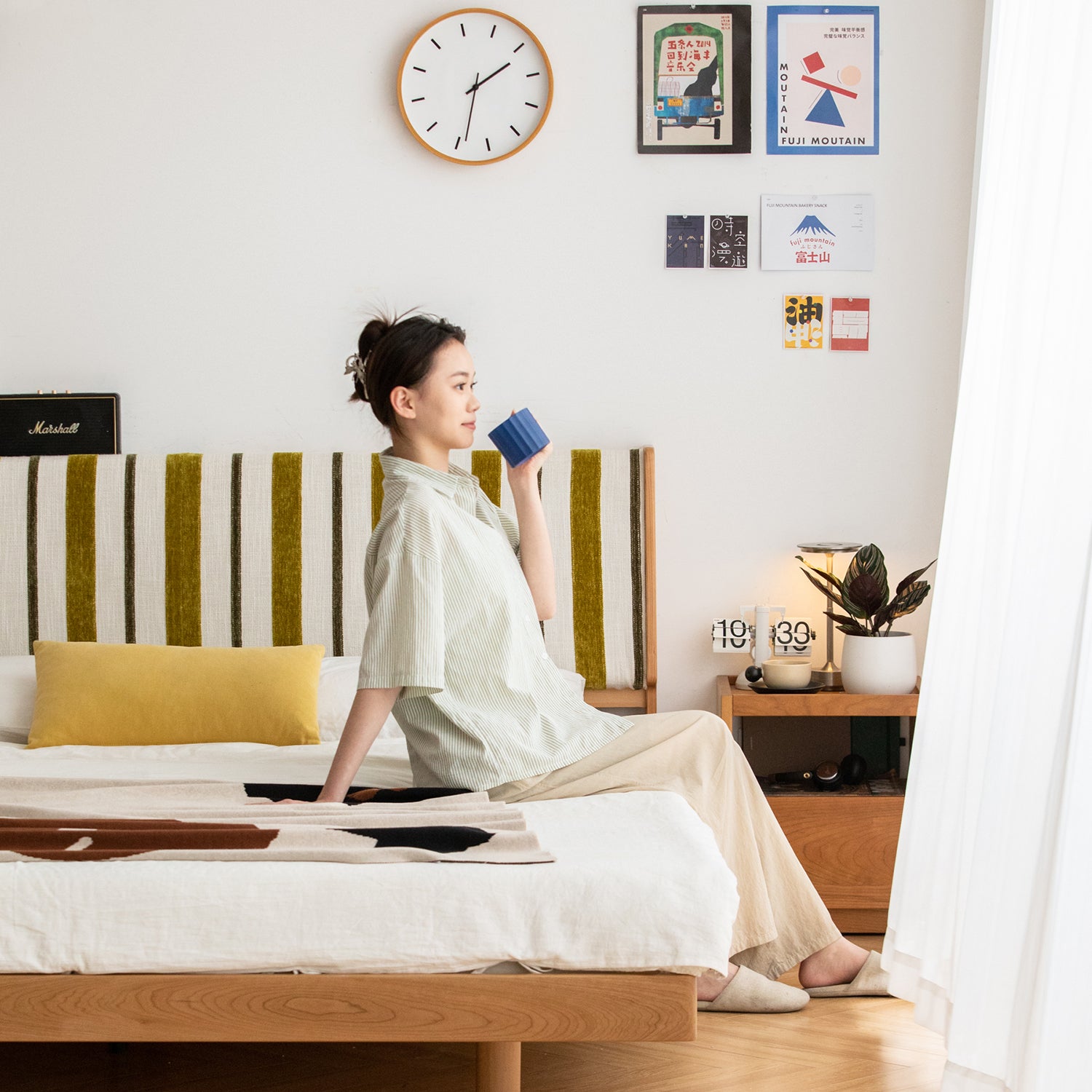 Scandinavian Mixed Wave Fabric Cherry Wood Bed LES blends minimalist Scandinavian design with solid cherry wood strength, creating a stylish and comfortable bedroom centerpiece.