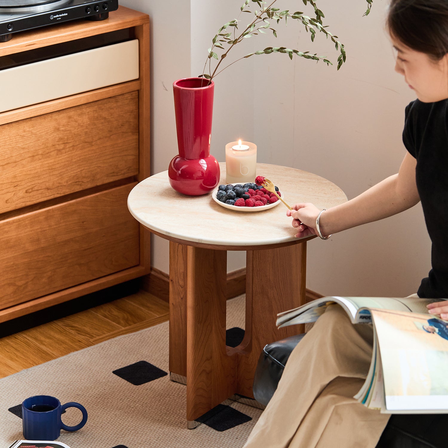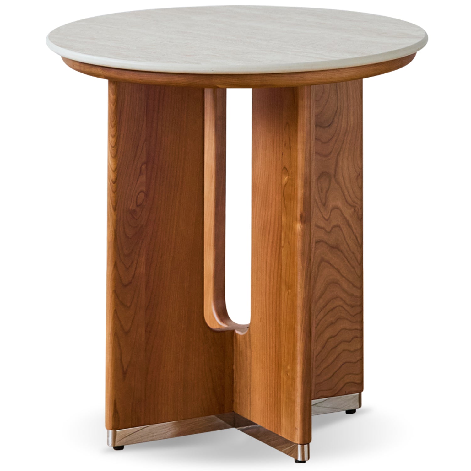 The combination of sintered stone tabletop and solid cherry wood legs brings a natural balance of durability and refined style to any living room.