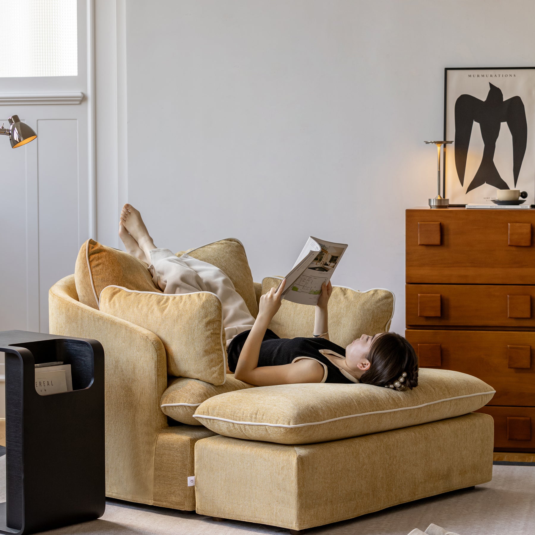 Scandinavian Chenille Velvet Fabric 1 Seater Sofa MIRA offers cloud-soft comfort with goose down and multi-layer foam support, blending luxury with timeless Scandinavian style.