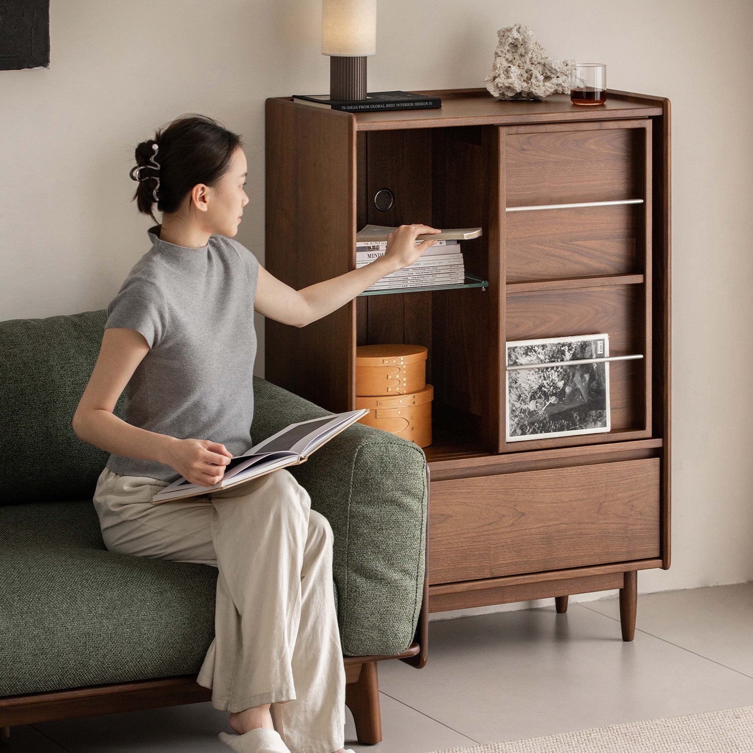 Vintage Walnut Wood Side Cabinet VISTA combines rich solid walnut wood, smart storage, and timeless proportions, creating a refined and dependable cabinet for modern living spaces.