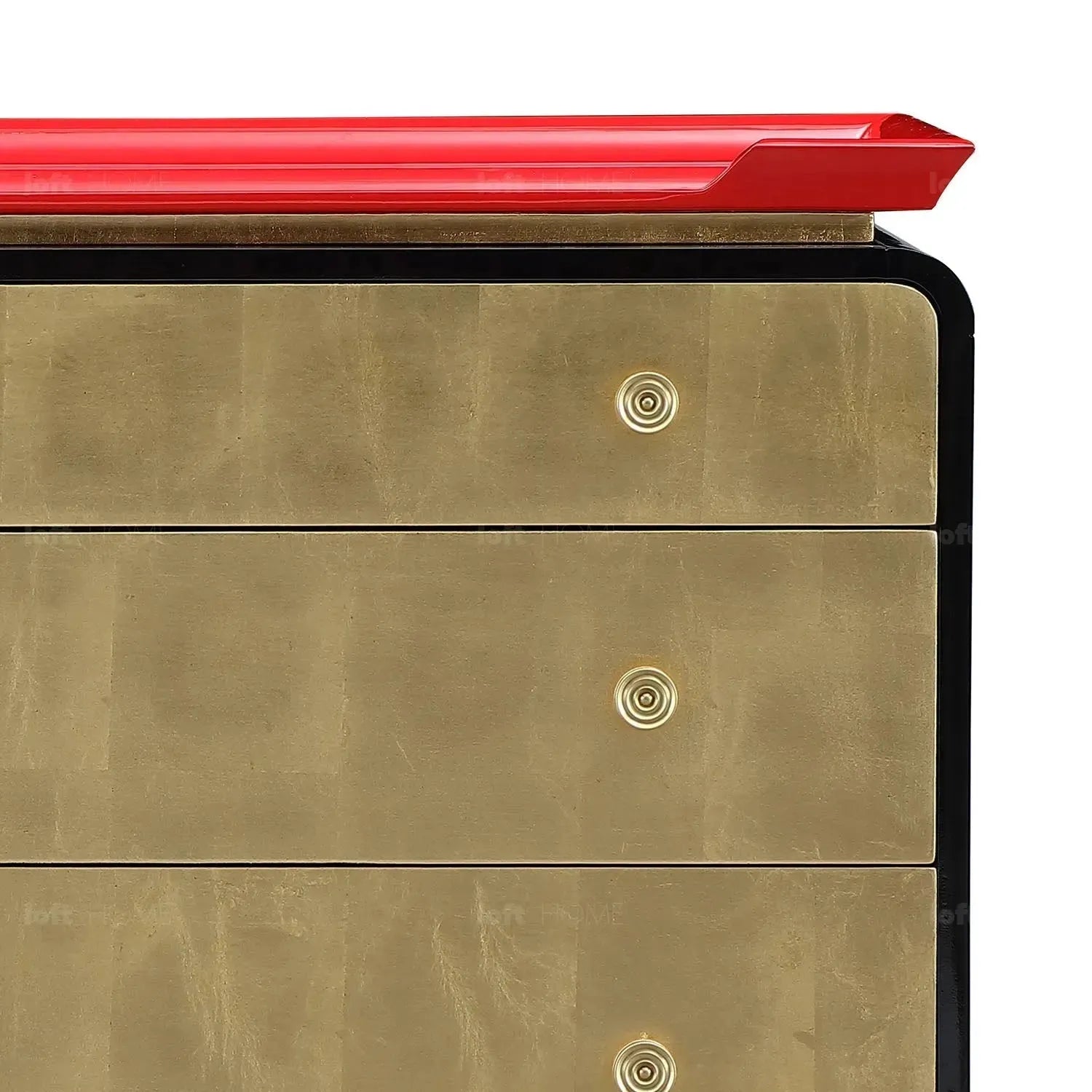 The Eclectic Wood Drawer Cabinet has dimensions of L1040 x W430x H870 mm, which provides an adequate storage space but is not too large. Owing to its well thought out dimensions, it can be very used in different settings. Vintage gilded accents on the special drawer panels add a hint of nostalgia. decorated with handles in the brass sculpted from aventurine to add a lot of elegance and pomp. It strikes a good balance between sophistication and also functionality.
