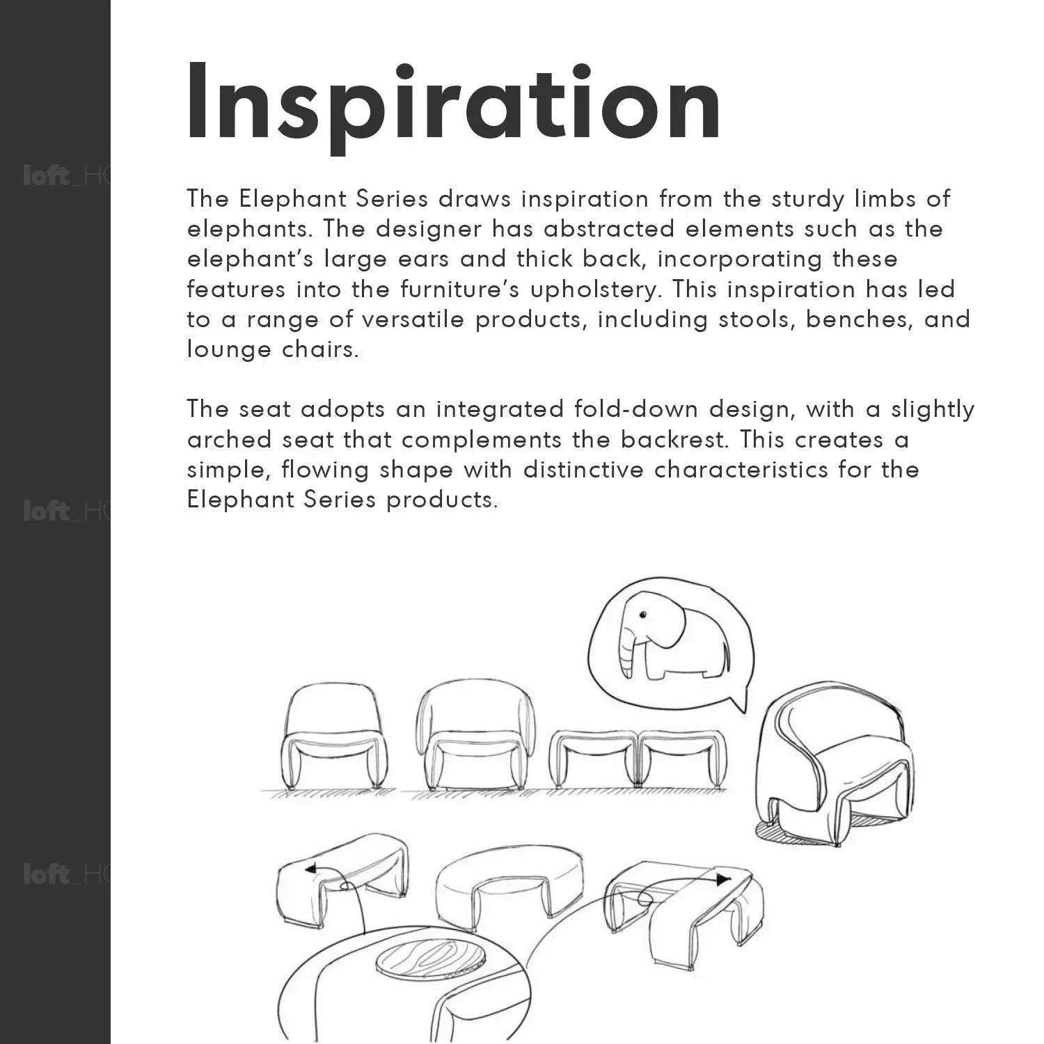 Inspired by the sturdy limbs and large ears of elephants, the Elephant Series features versatile products like stools, benches, and lounge chairs, incorporating these unique elements into the upholstery.