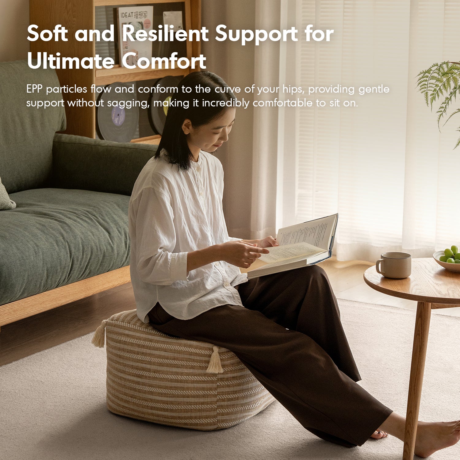 The Modern Mixed Weave Fabric Ottoman BEANIE offers exceptional comfort with its eco-friendly EPP particle filling that moulds to your body for resilient support. This versatile ottoman functions as a footrest, shoe bench, or kids' seat. With elegant tassel accents, a removable, washable cover, and durable craftsmanship, it's a stylish and practical addition to any space, providing comfort, flexibility, and timeless design.
