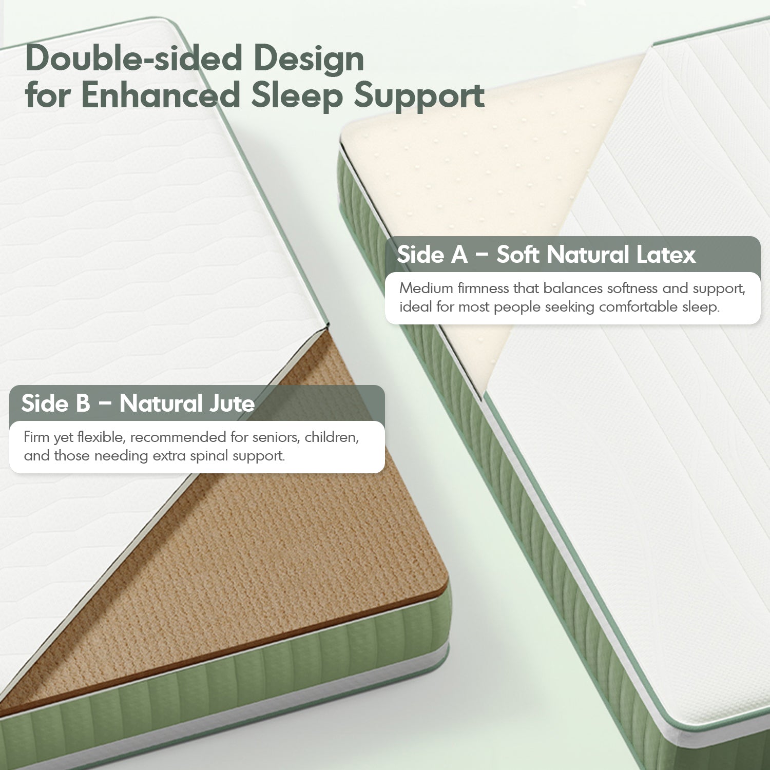 Side A features soft, responsive natural latex for balanced support and comfort. Side B uses natural jute for firm, breathable spinal support, ideal for children, seniors, and those seeking extra support.