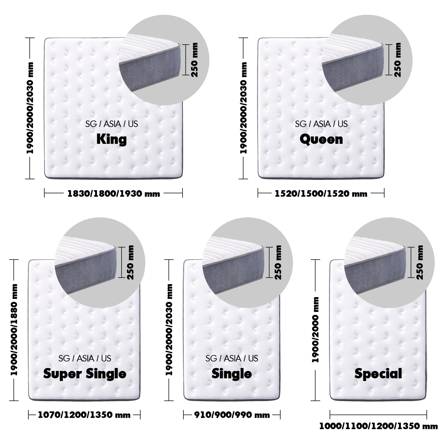 Size SG Single: W910 x L1900 x H80mm, Asia Single: W900 x L2000 x H80mm, SG Super Single: W1070 x L190... SG Single: W910 x L1900 x H200mm, Asia Single: W900 x L2000 x H200mm, SG Super Single: W1070 x L1... SG Single: W910 x L1900 x H250mm, Asia Single: W900 x L2000 x H250mm, SG Super Single: W1070 x L1... SG Single: W910 x L1900 x H300mm, Asia Single: W900 x L2000 x H300mm, SG Super Single: W1070 x L1... SG Single: W910 x L1900 x H350mm, ASIA Single: W900 x L2000 x H350mm, SG Super Single: W1070 x L1...