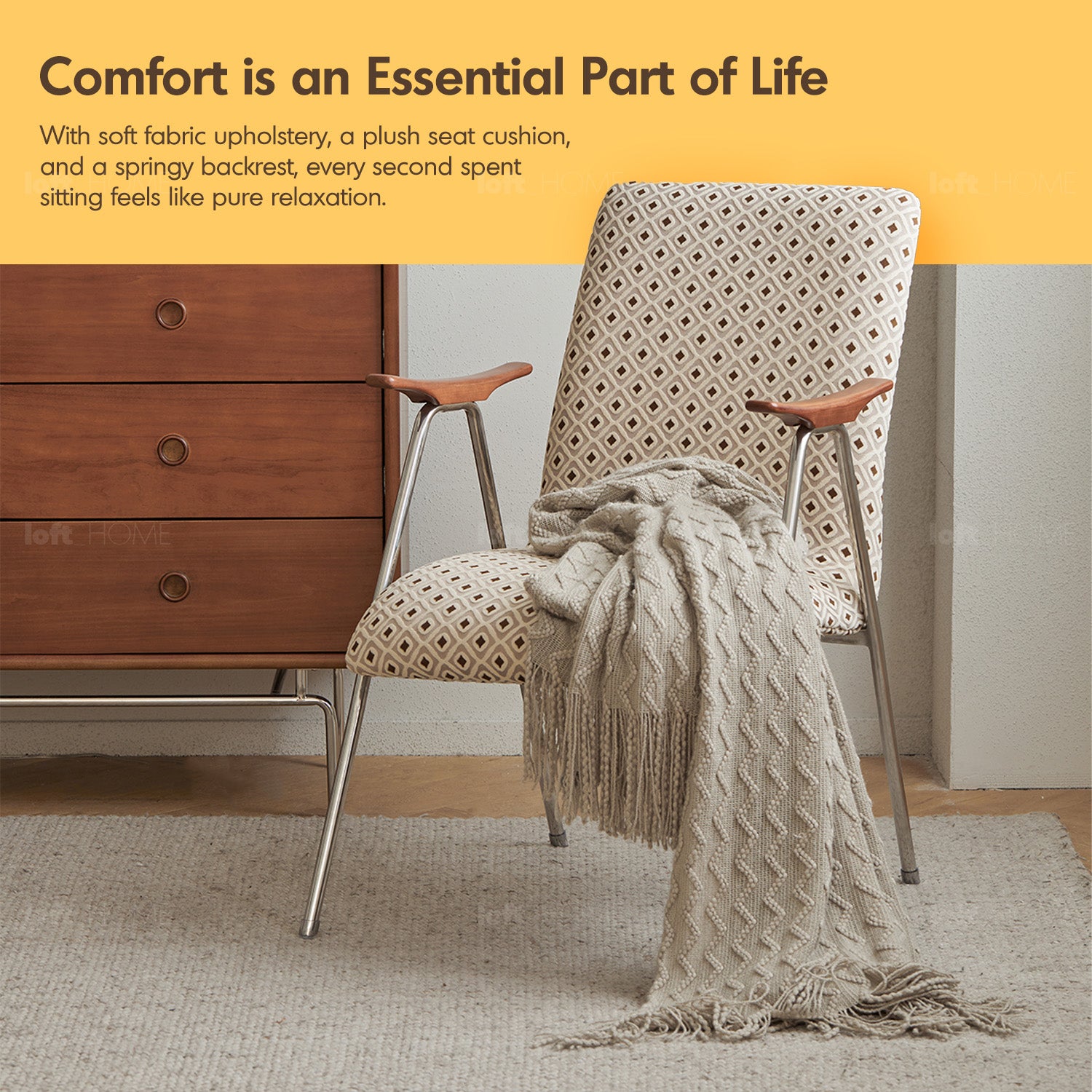 A seamless blend of fabric, metal, and wood, featuring clean lines and striking aesthetics. |
