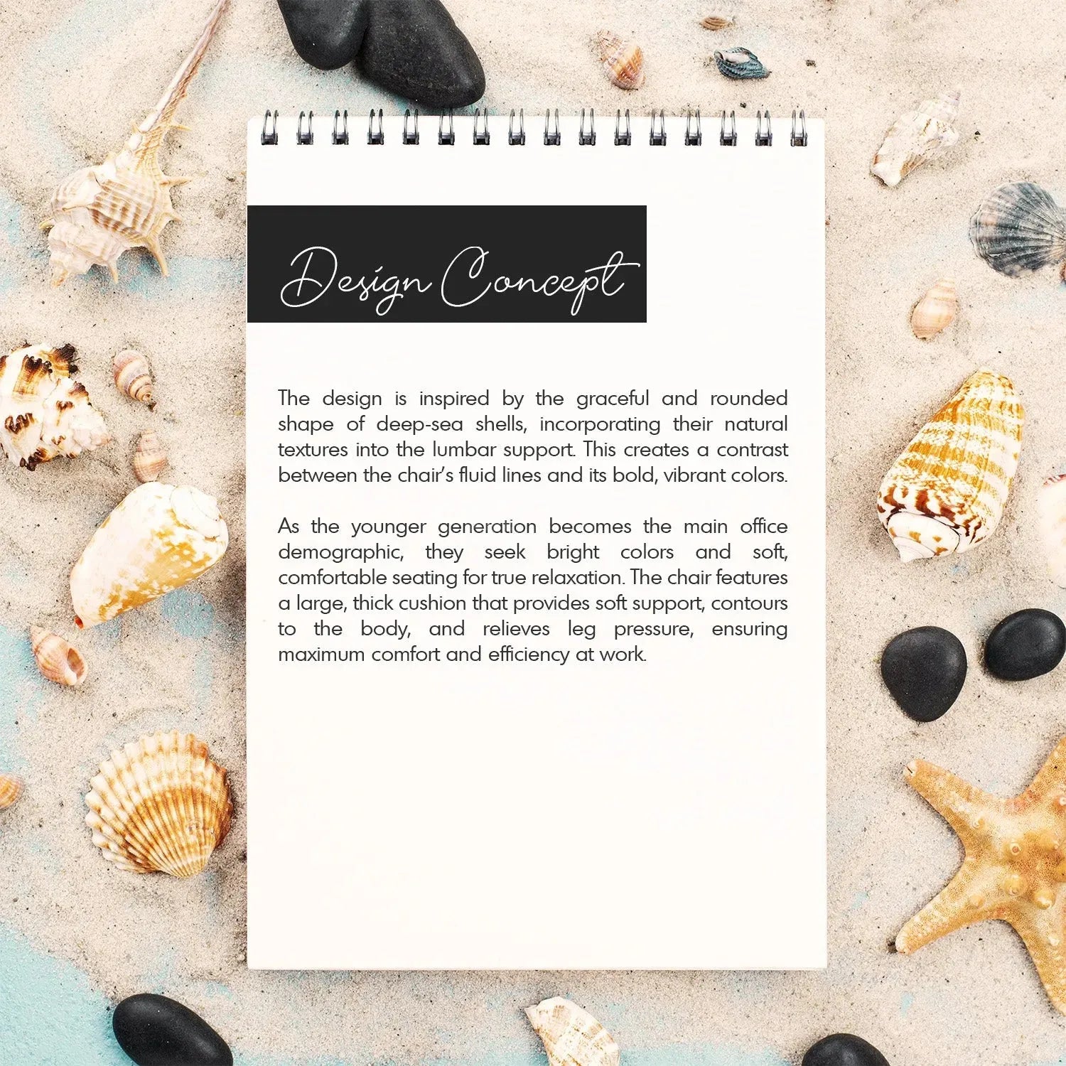 The shell-inspired lumbar support offers stylish, biometric design, ensuring maximum back support while capturing the attention of young professionals.