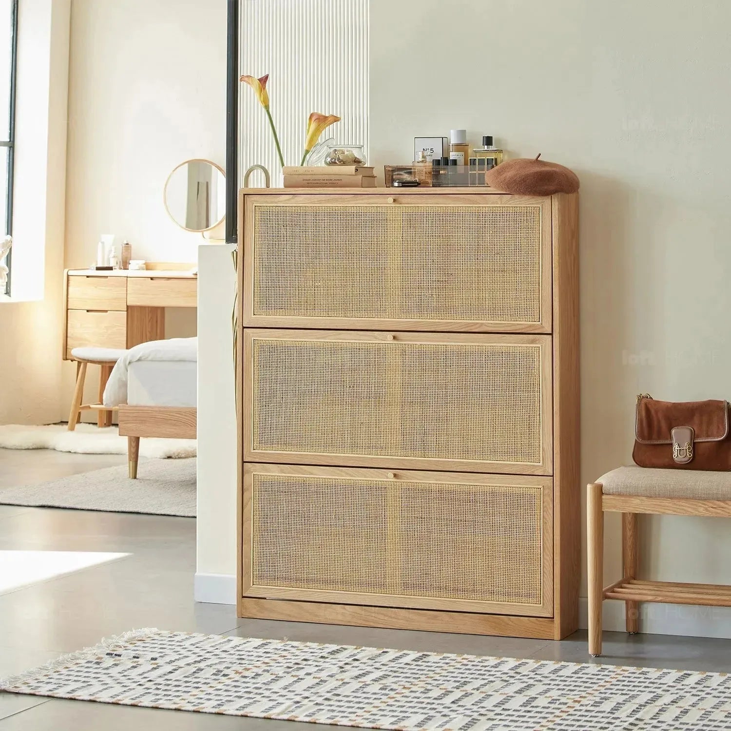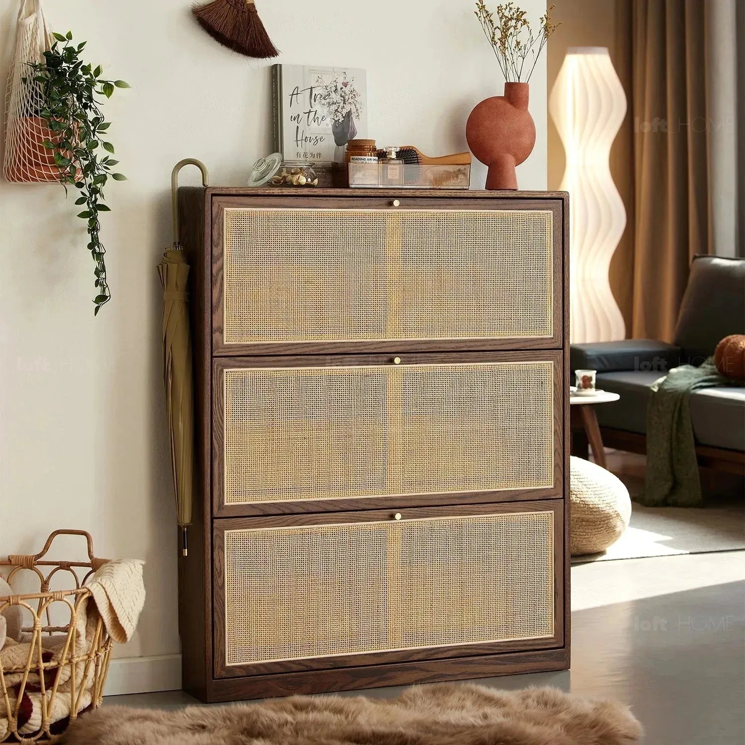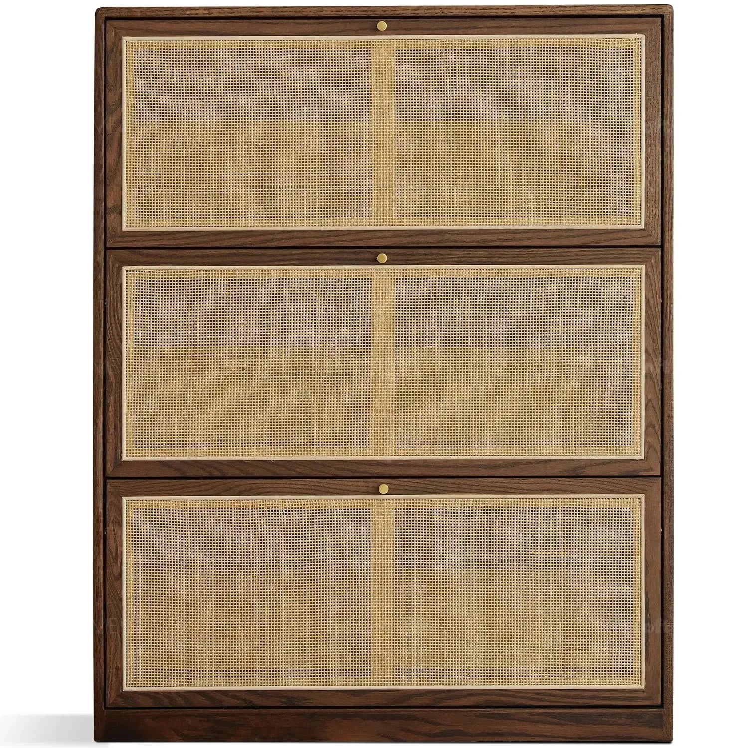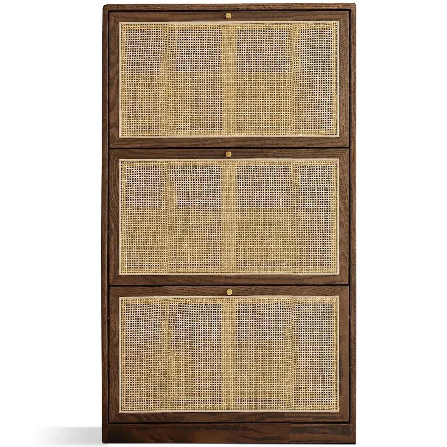 Elevate your everyday routine with a touch of elegance and practicality. This shoe cabinet is designed to fit perfectly in narrow spaces, while its rattan cabinet doors provide a breathable environment for your shoes, making your entryway exceptionally fresh and organized. Available in two finishes, natural and walnut, it is the perfect addition to any home that combines style and functionality.
