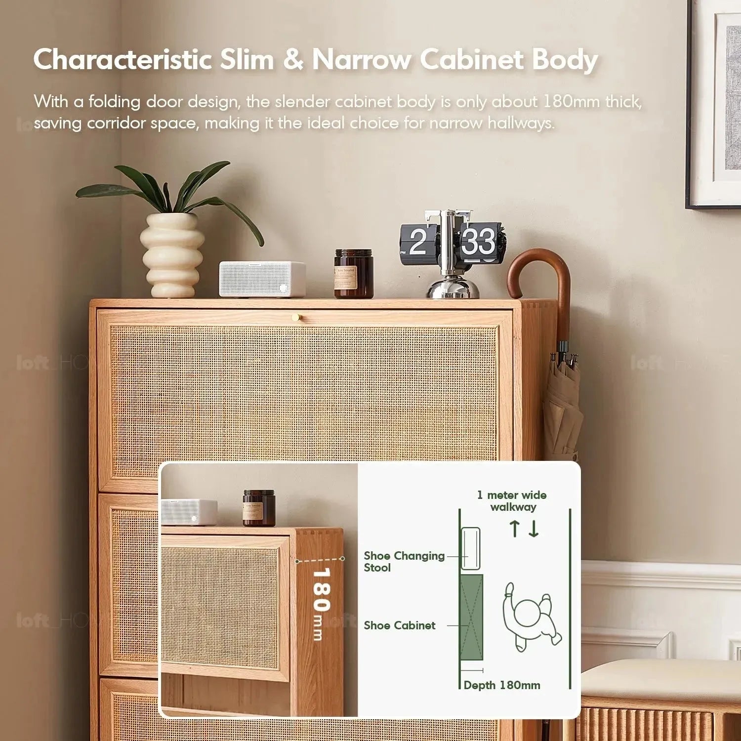 Perfect for narrow hallways, with flip-door mechanism is ideal for tight entryways, measuring only around 180mm.