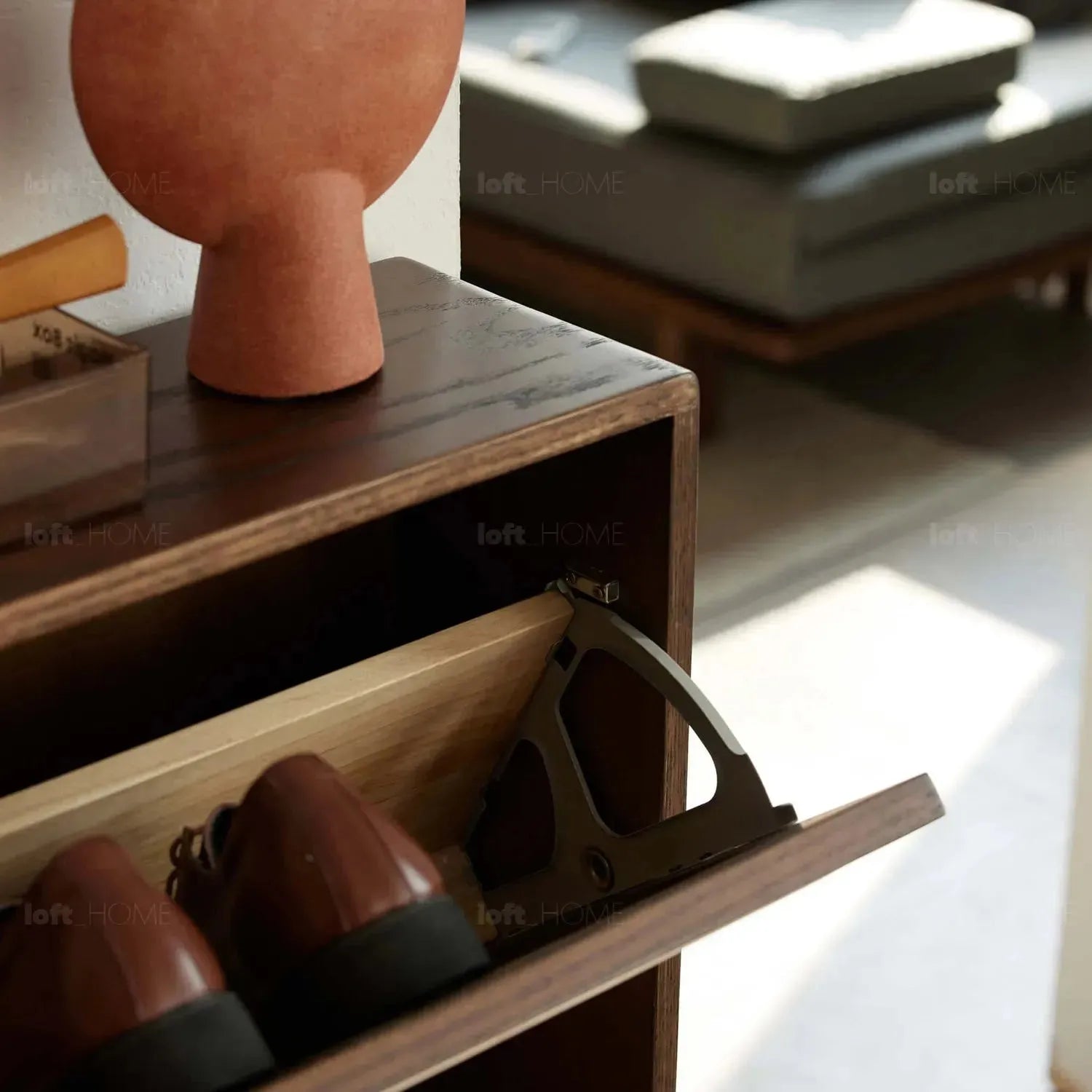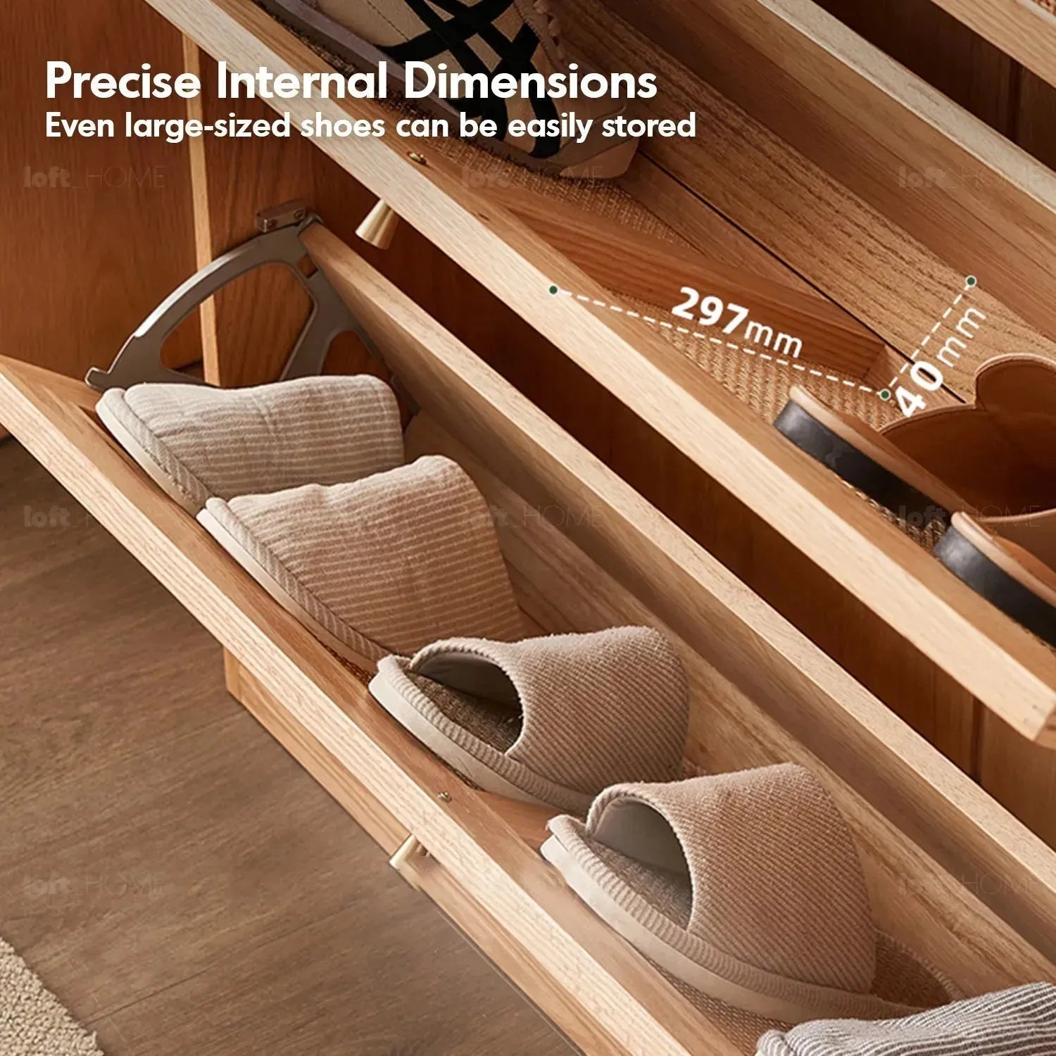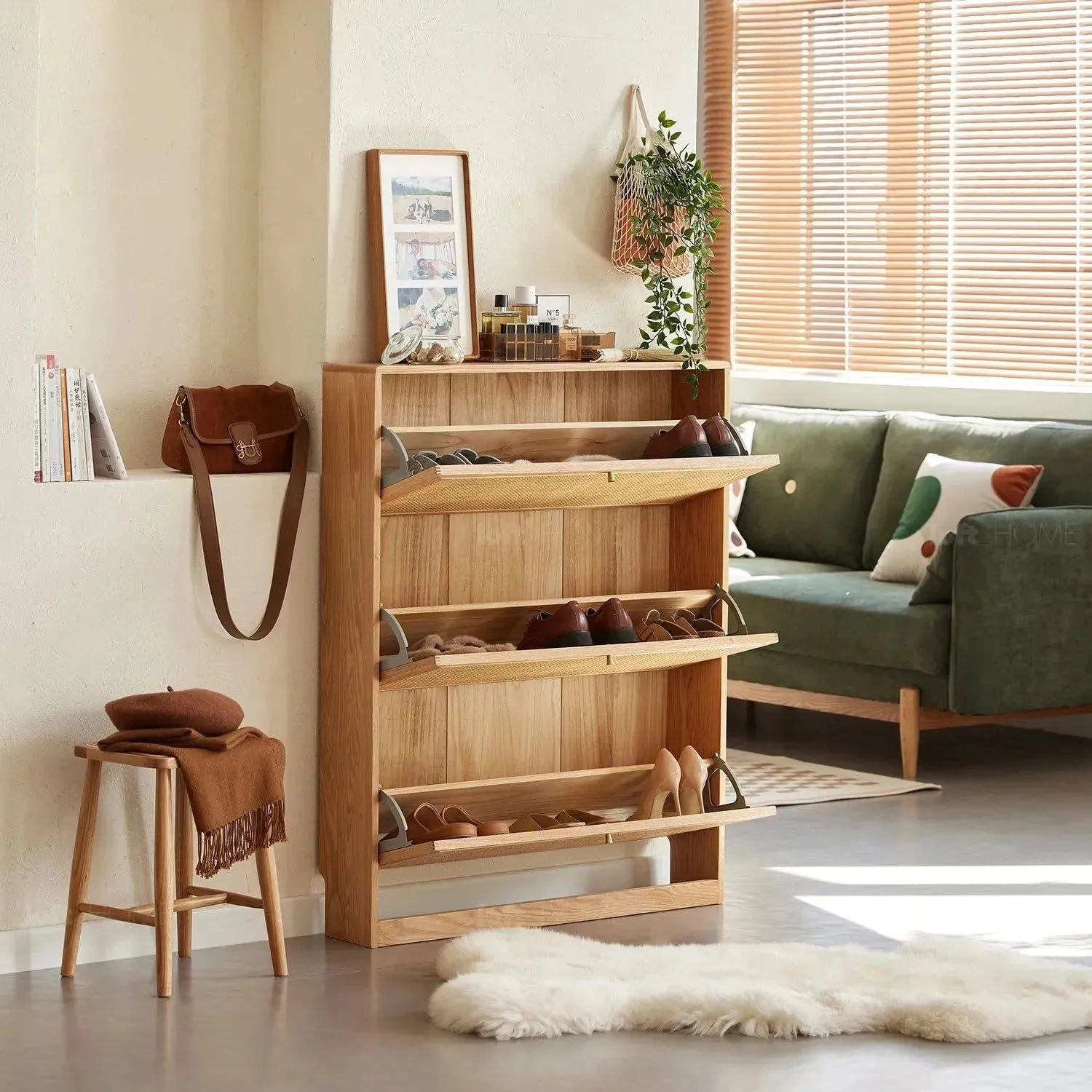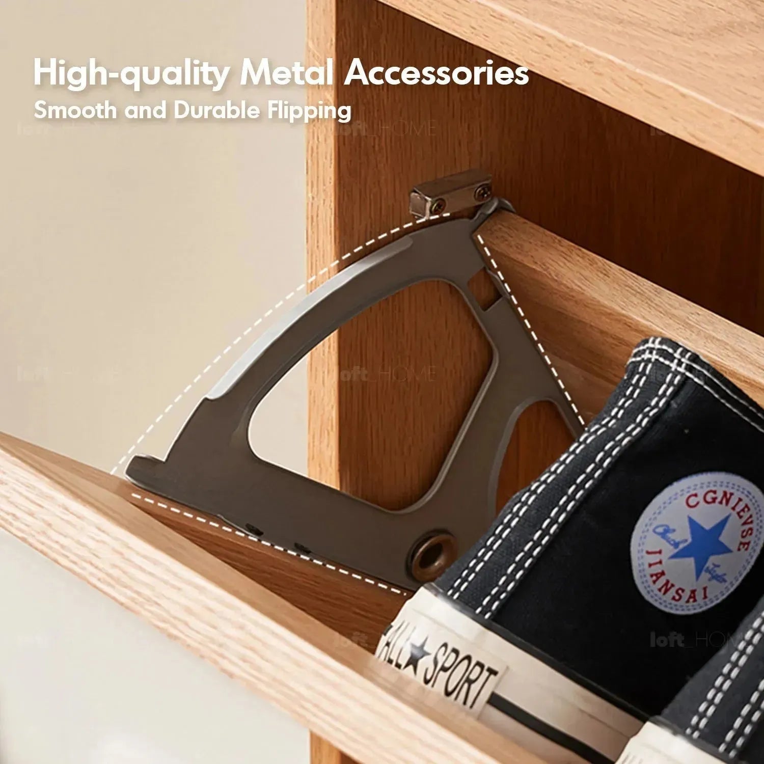 Design featuring flip drawer storage and a partitioned layout to meet seasonal footwear storage needs. High-quality metal fittings ensure smooth and durable flipping.
