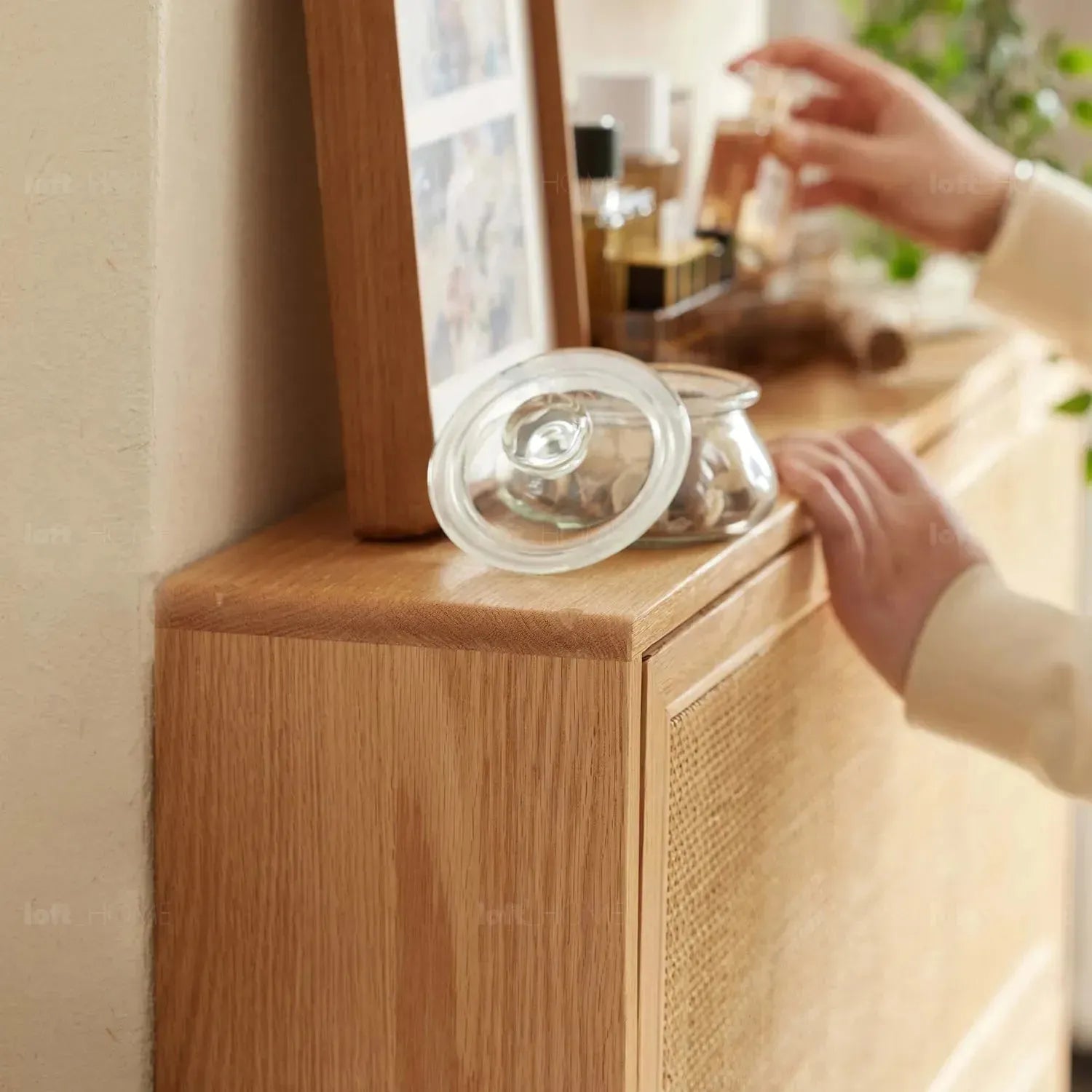 This furniture piece is versatile, practical, and has an artistic charm. Made of fresh oak and rustic wicker, it's durable and easy to maintain. The breathable wicker surface keeps your space elegant and tidy.