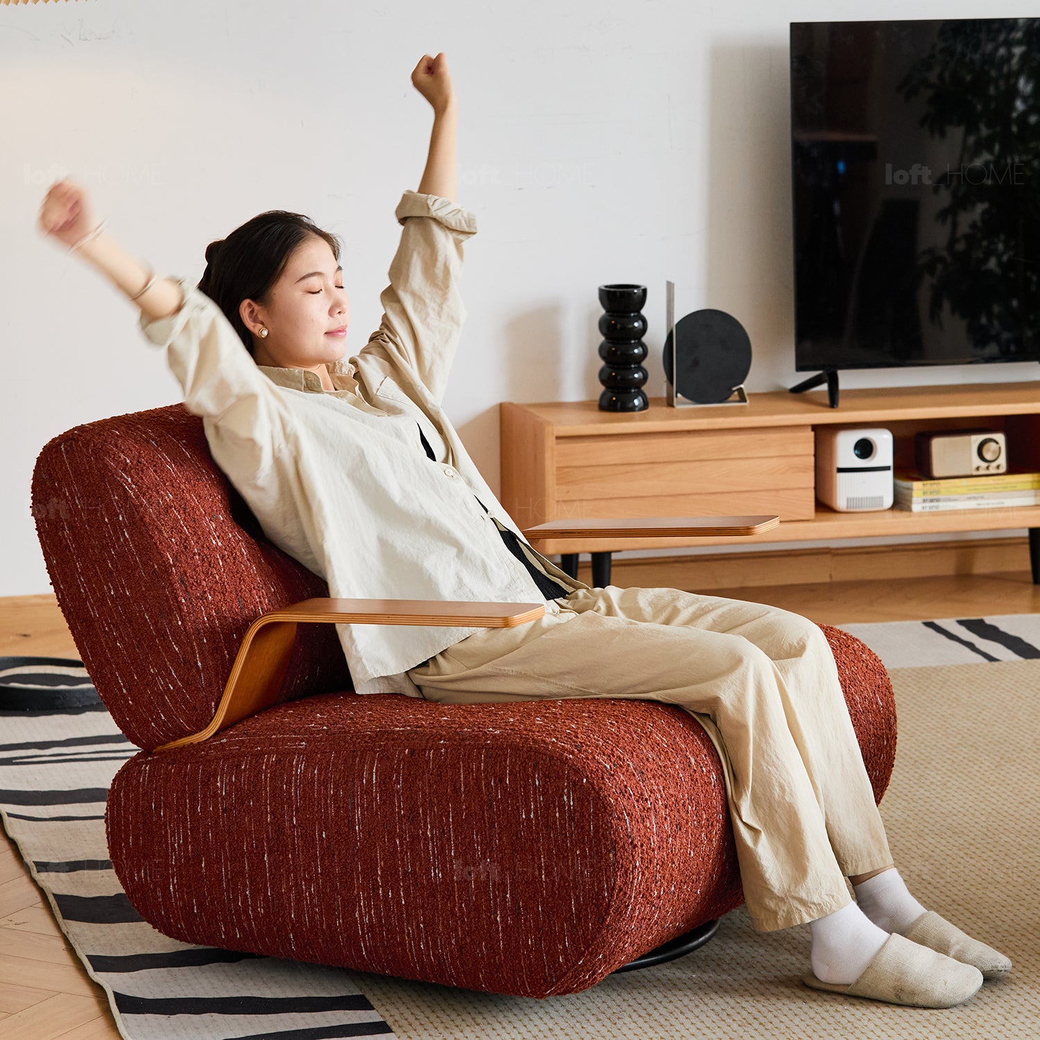 Modern Mixed Weave Fabric Revolving 1 Seater Sofa BENNY offers 360° rotation, plush comfort, and compact design—perfect for stylish lounging in small spaces.