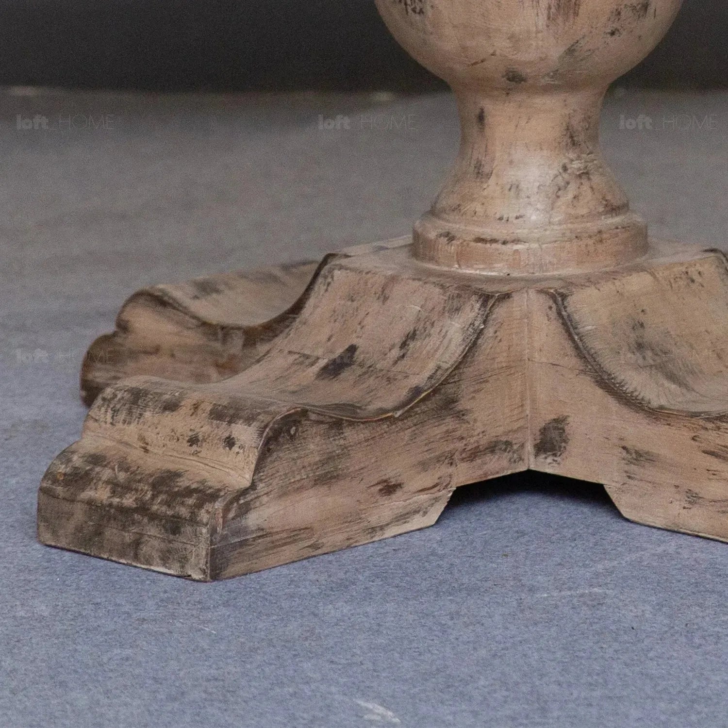 Rustic Pine Wood Round Dining Table WILLOW featuring a thick, robust structure with a vintage classic design, this table offers an elegant round shape with intricate detailing. Its versatile decor compatibility makes it a timeless addition to any dining space.