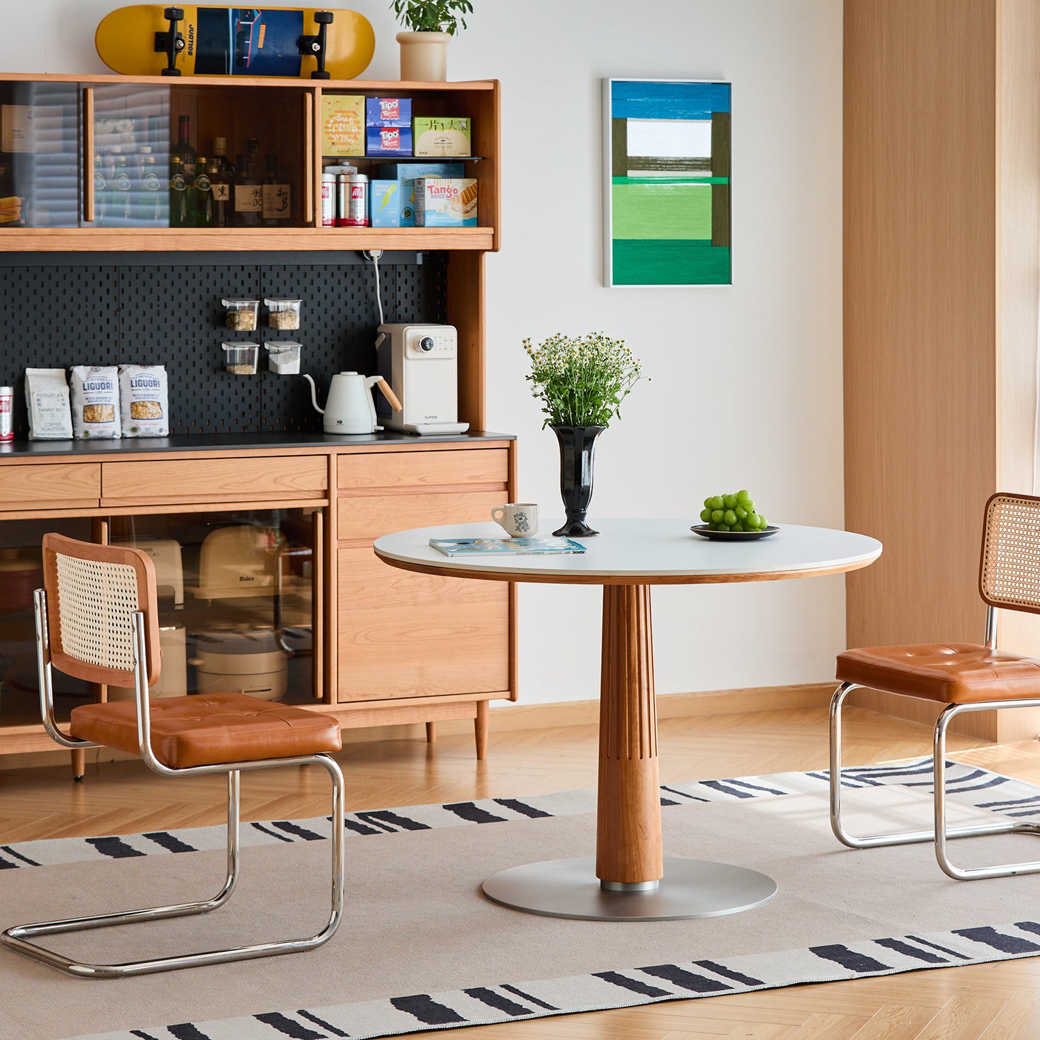 A solid cherry wood base adds natural warmth and visual balance, bringing a refined Scandinavian touch to your dining space.