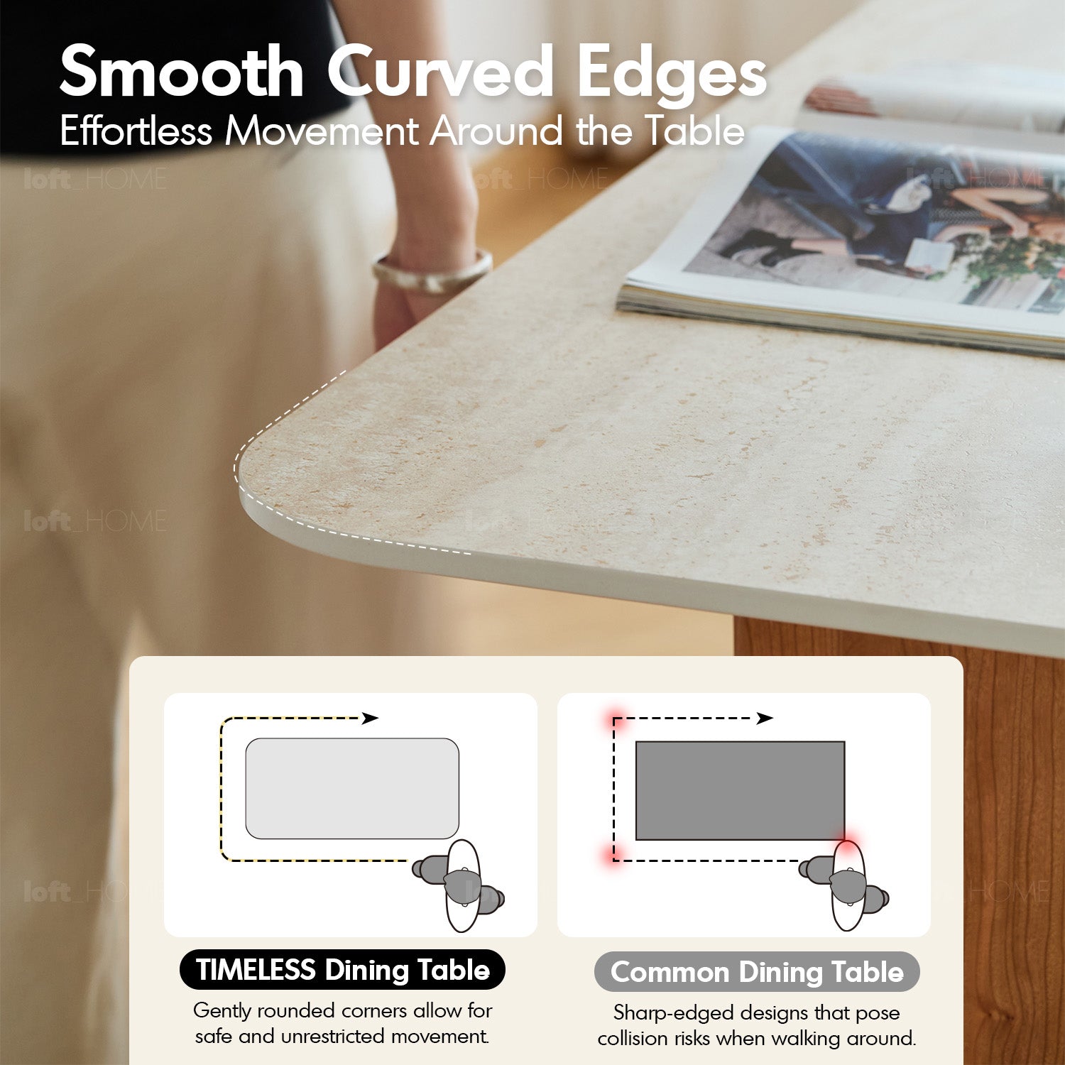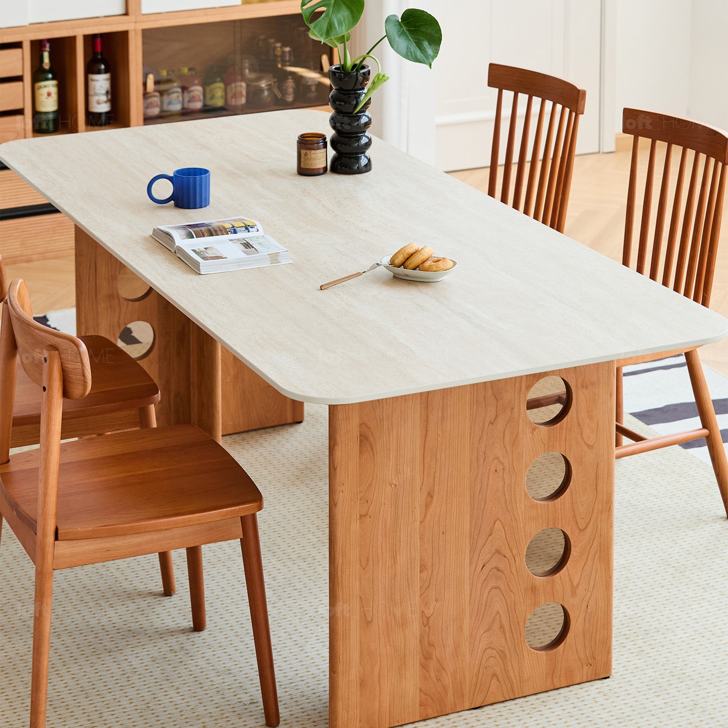 Scandinavian Cherry Wood Sintered Stone Dining Table TIMELESS combines Bauhaus-inspired aesthetics, durable cherry wood, and a refined travertine-textured stone top for a stylish and spacious dining experience.