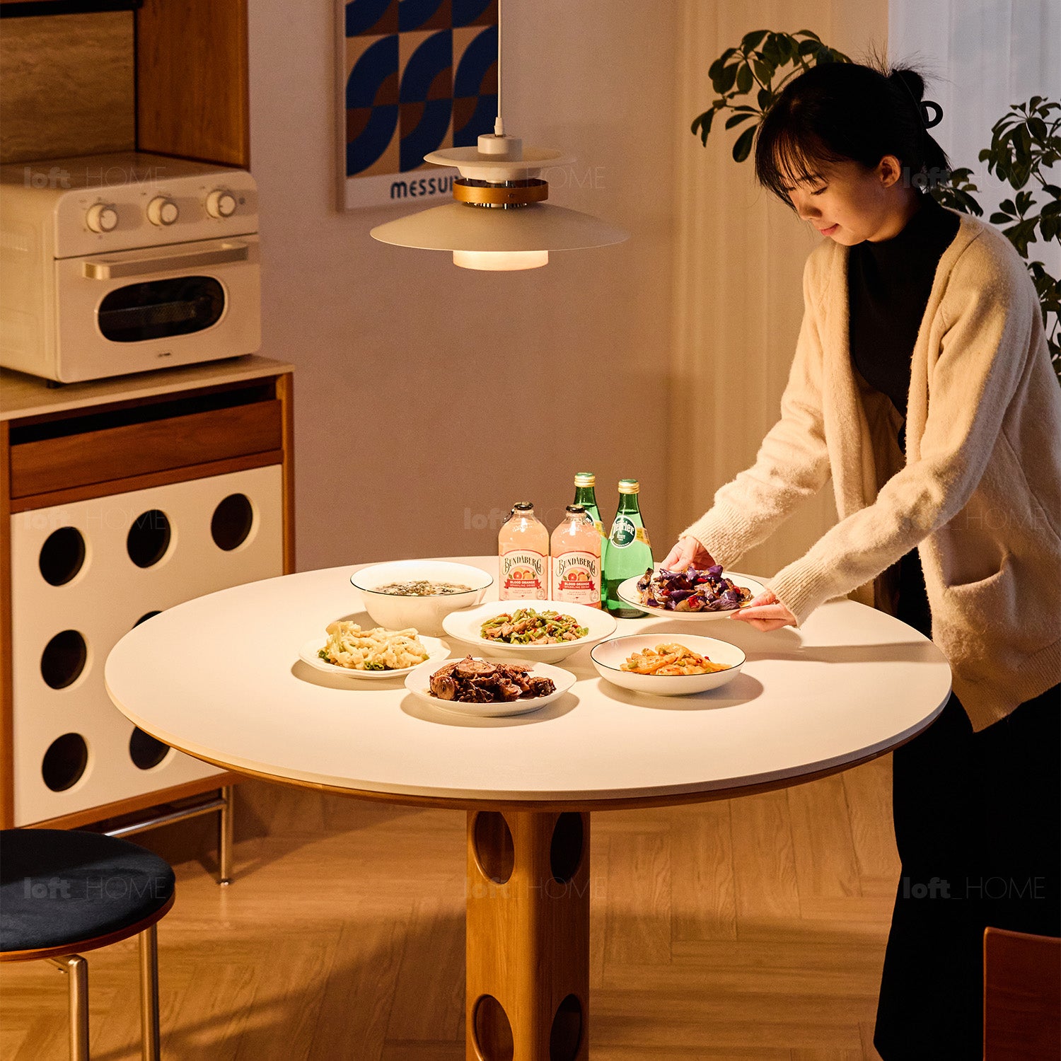 A tribute to Bauhaus, blending polka dots, wood, and form for a unique mid-century modern look.