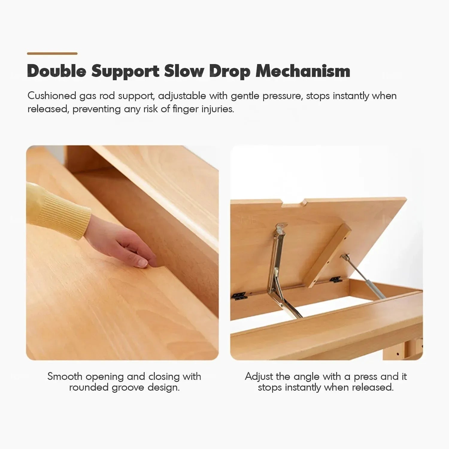 European-imported solid beech wood forms the frame of our kid's study table, with decorative components and handles made from FAS-certified North American black walnut wood. An adjustable tabletop can satisfy different study ideas, increasing ergonomic comfort. It is stable and can hold up to 150kg because it has four stoppers. You will have a trusty companion on your educational journey.