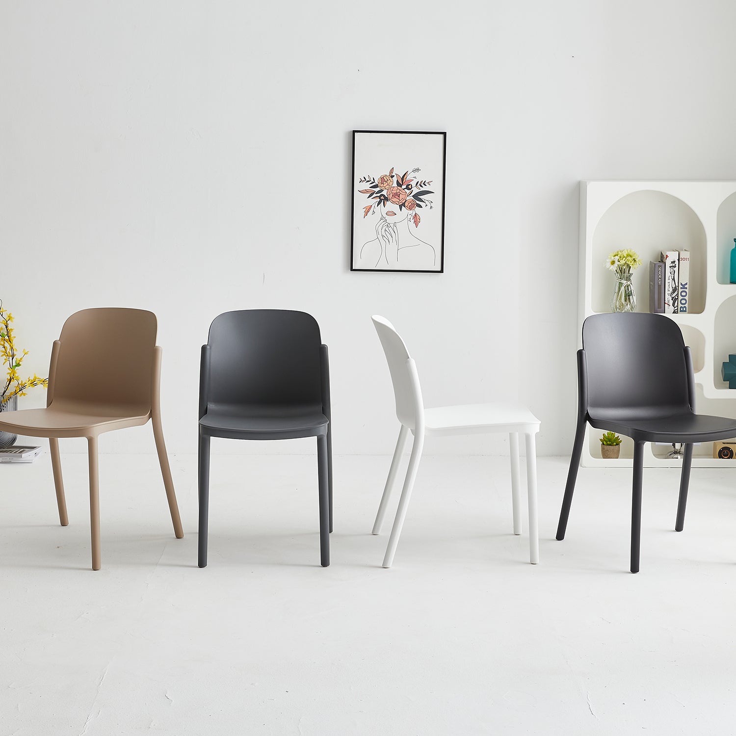 Contemporary plastic stackable dining chair glint in real life style.