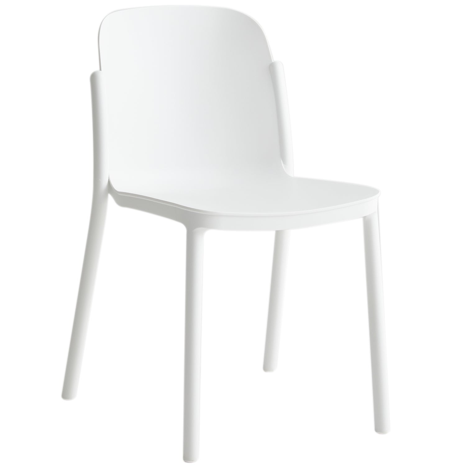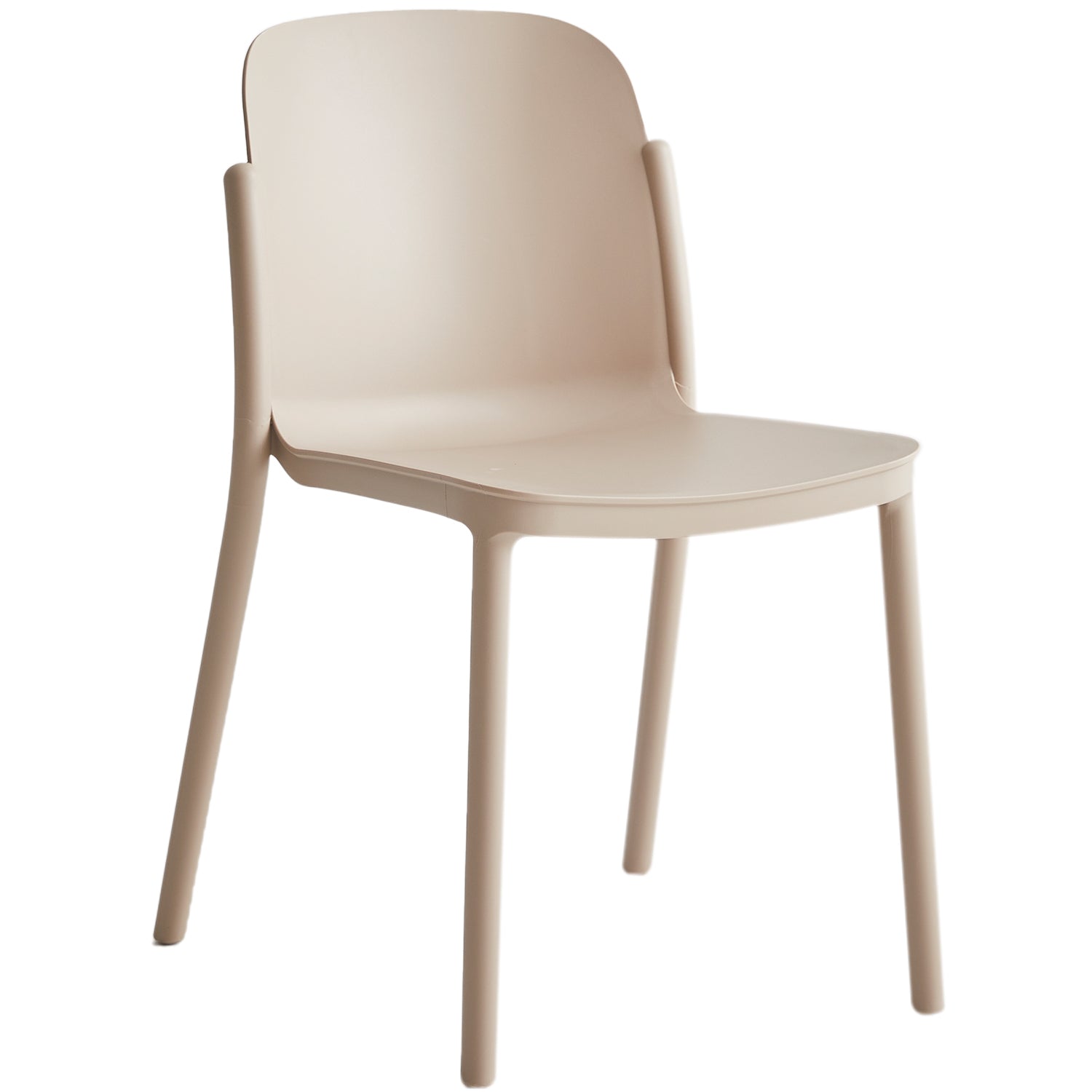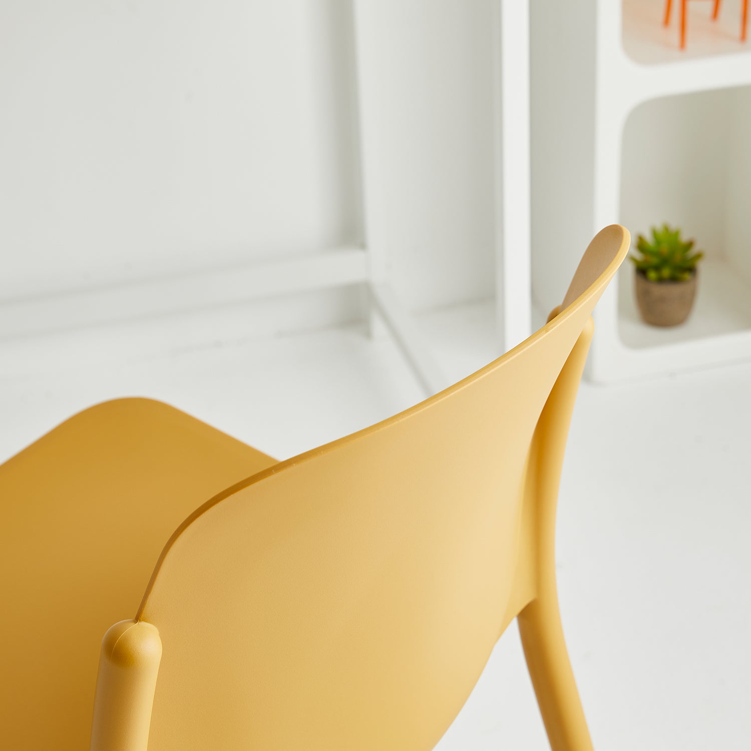 Contemporary plastic stackable dining chair glint in still life.