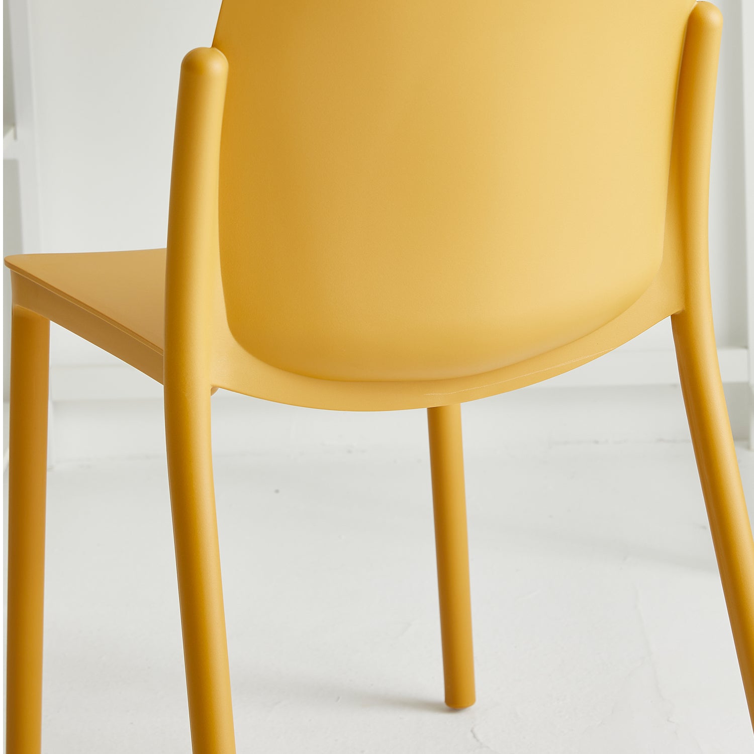 Contemporary plastic stackable dining chair glint in close up details.