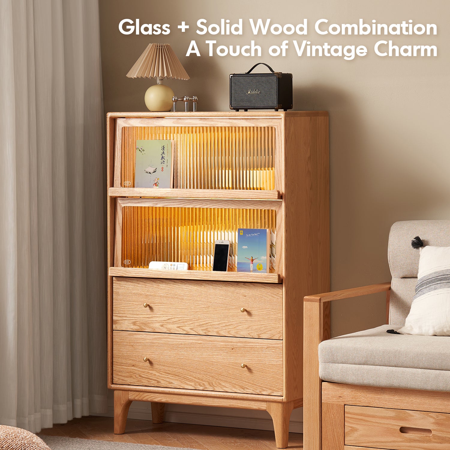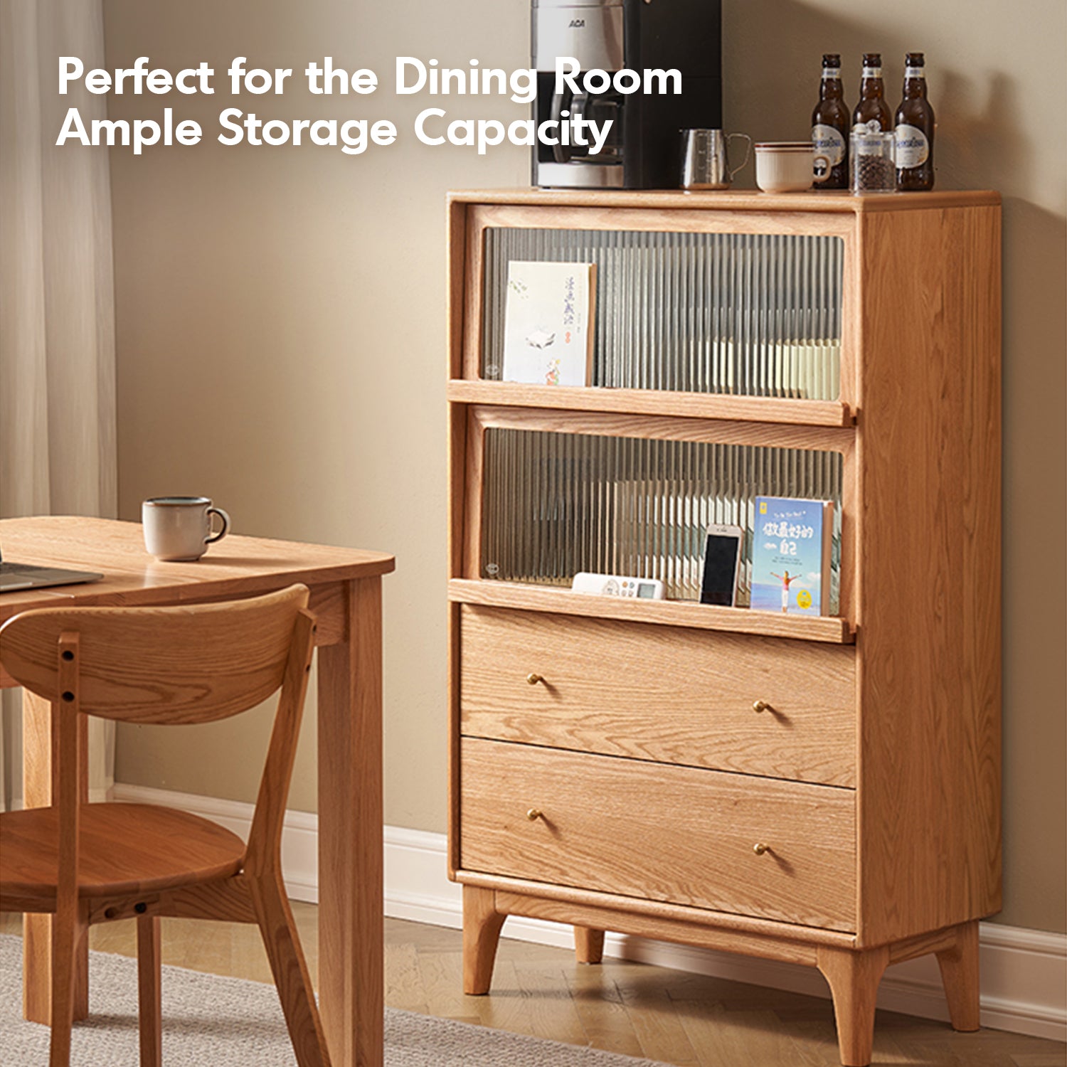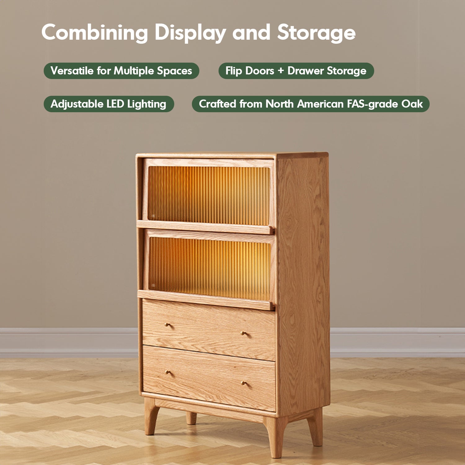 Features a balanced layout with spacious top storage, flip-up glass doors, and enclosed double drawers for dustproof organization. |