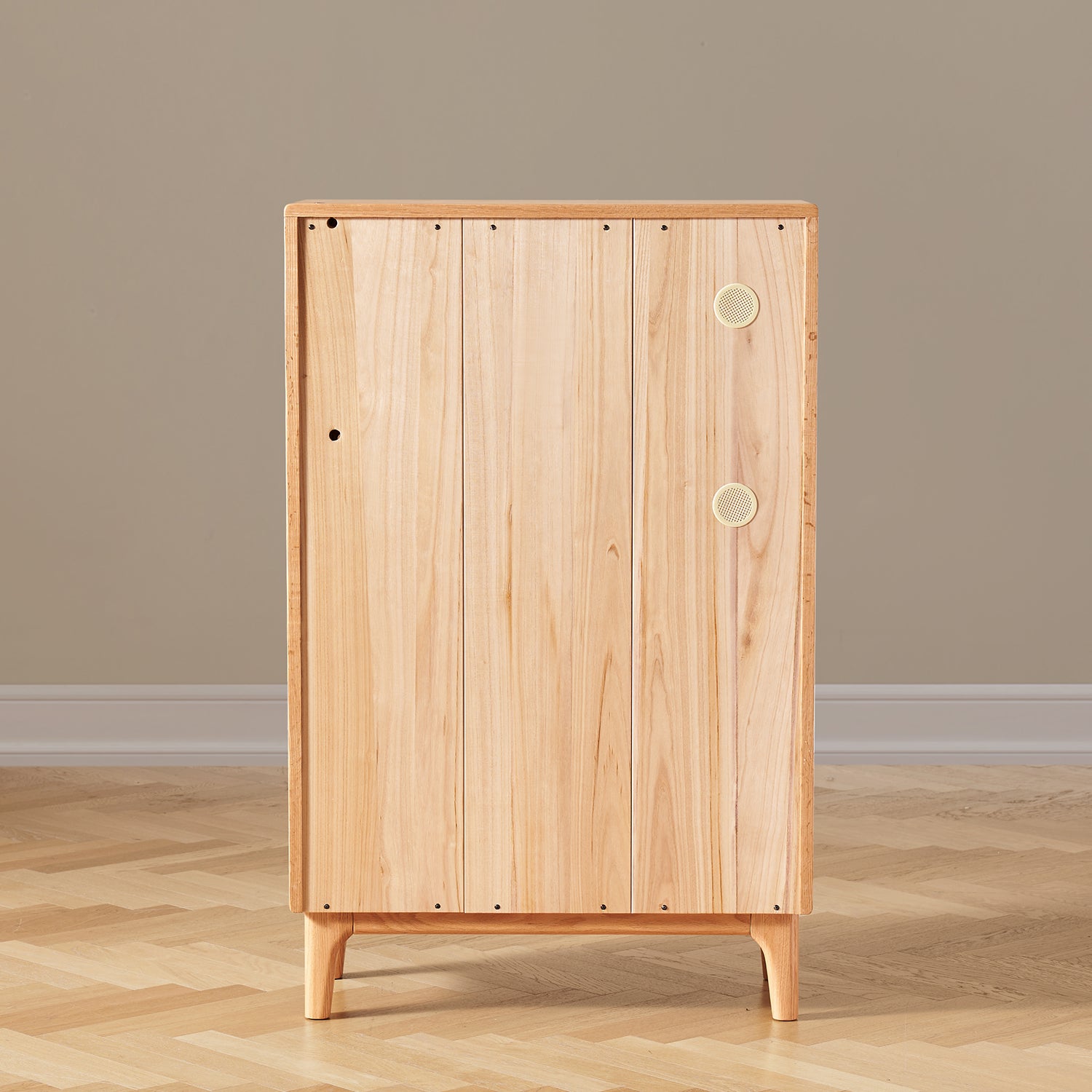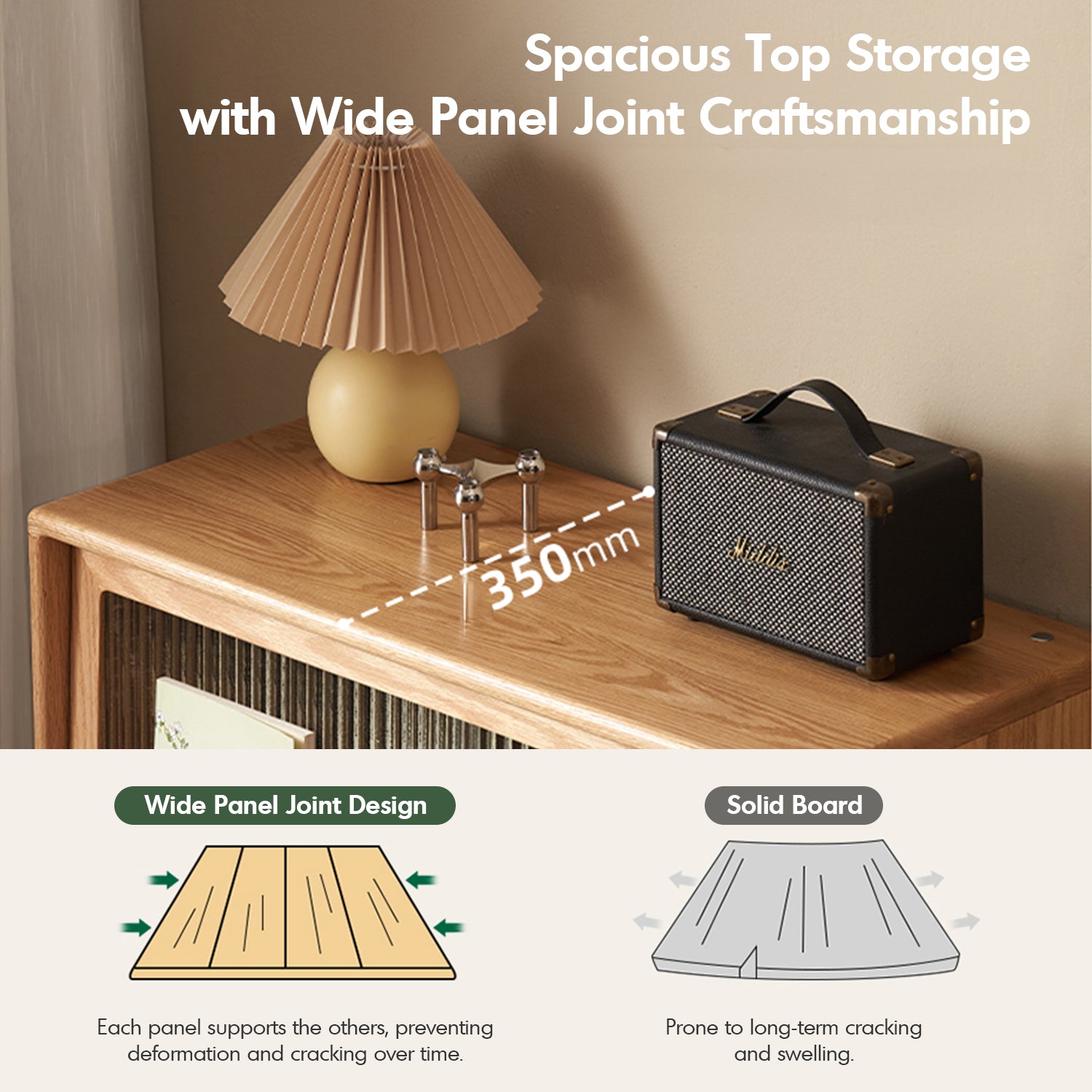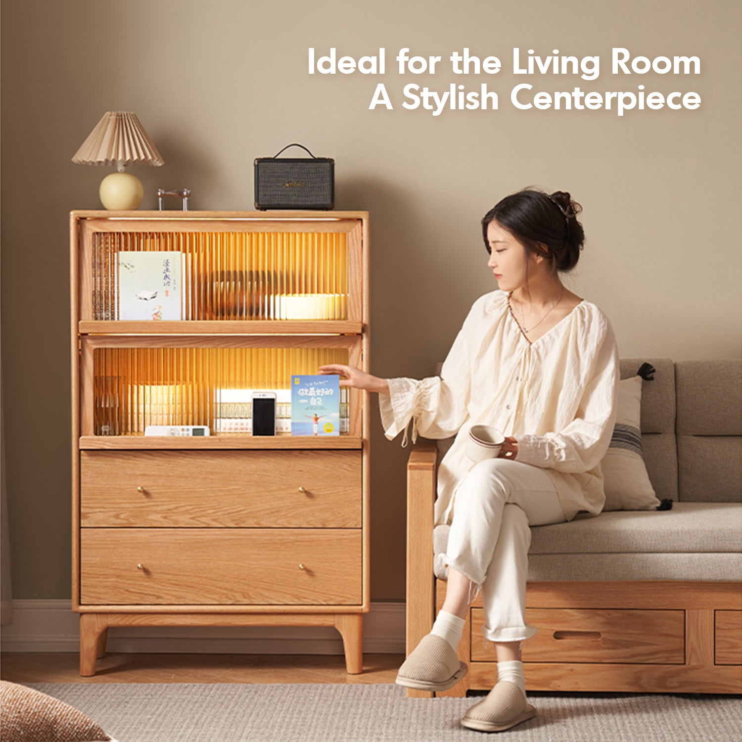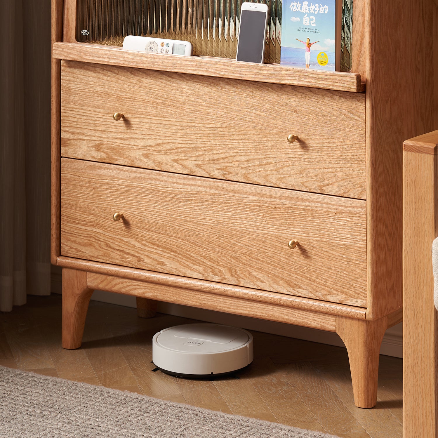 Features a balanced layout with spacious top storage, flip-up glass doors, and enclosed double drawers for dustproof organization. |