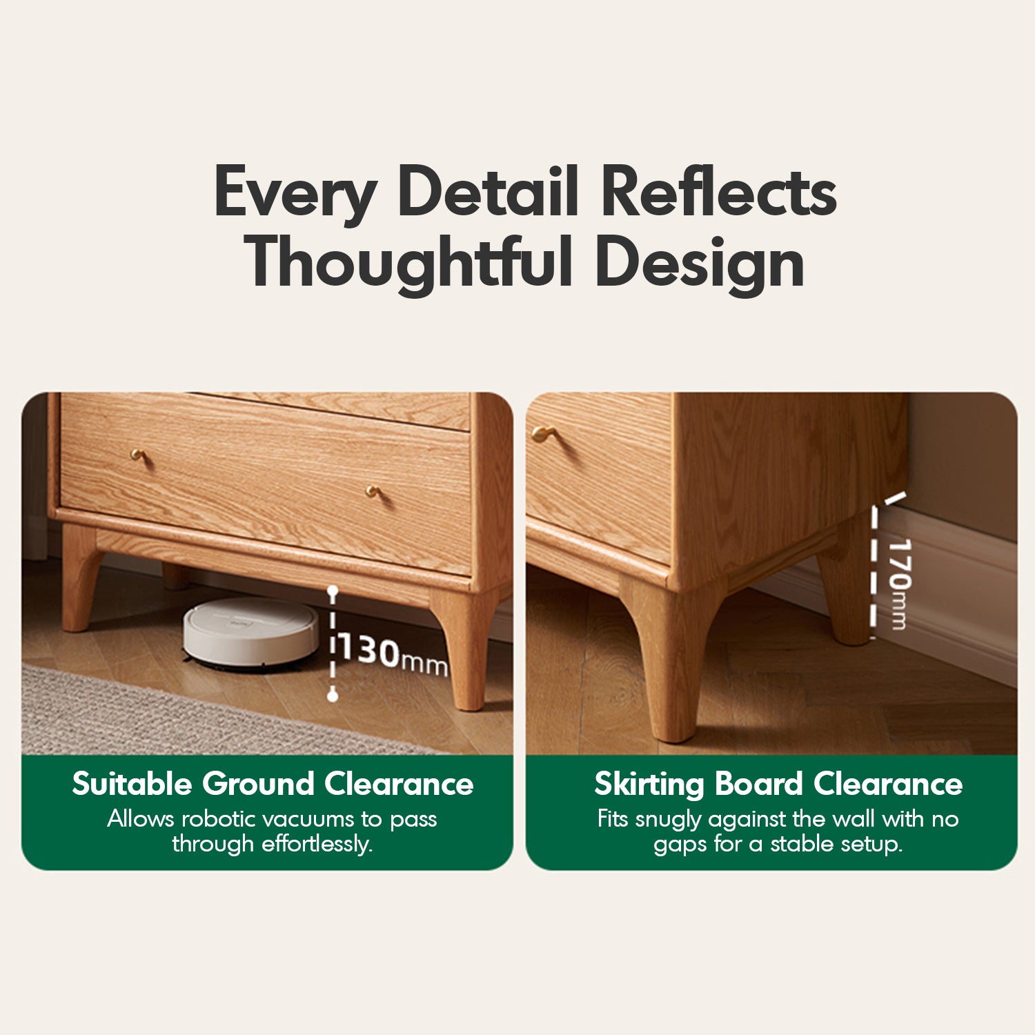 Optimal height for easy access, ground clearance for robotic vacuums, and snug skirting board clearance for a stable fit. |