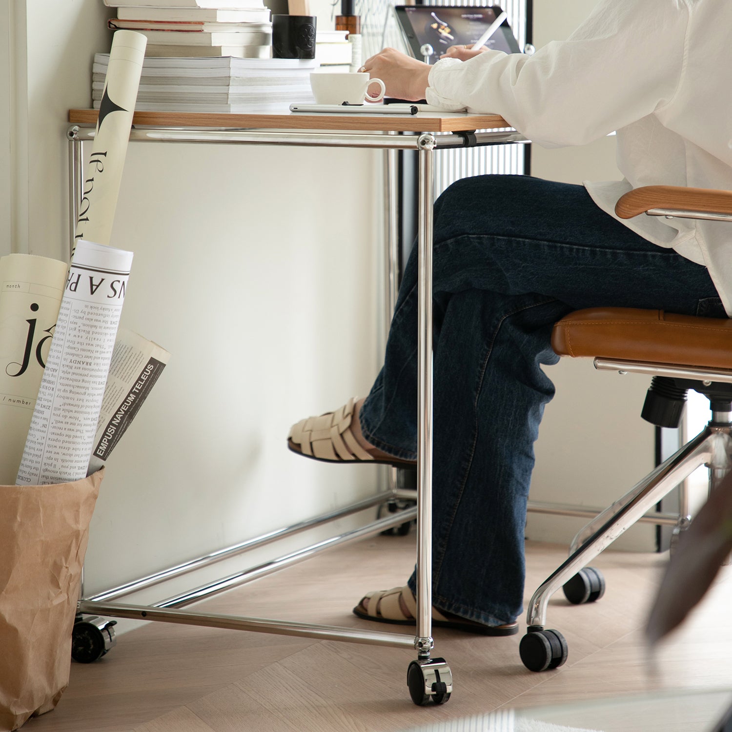 Minimalist steel wheeled study table usm in still life.