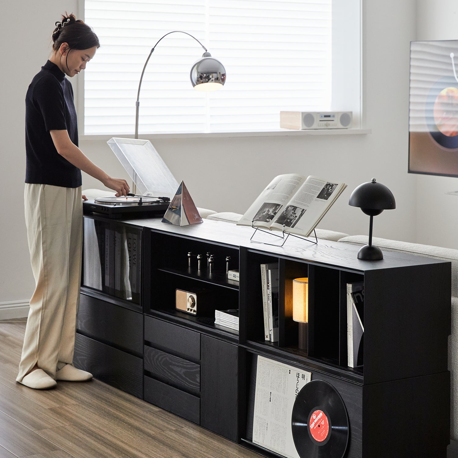 Open and closed compartments support display and concealed storage, helping you organize everyday items while keeping a clean visual balance.