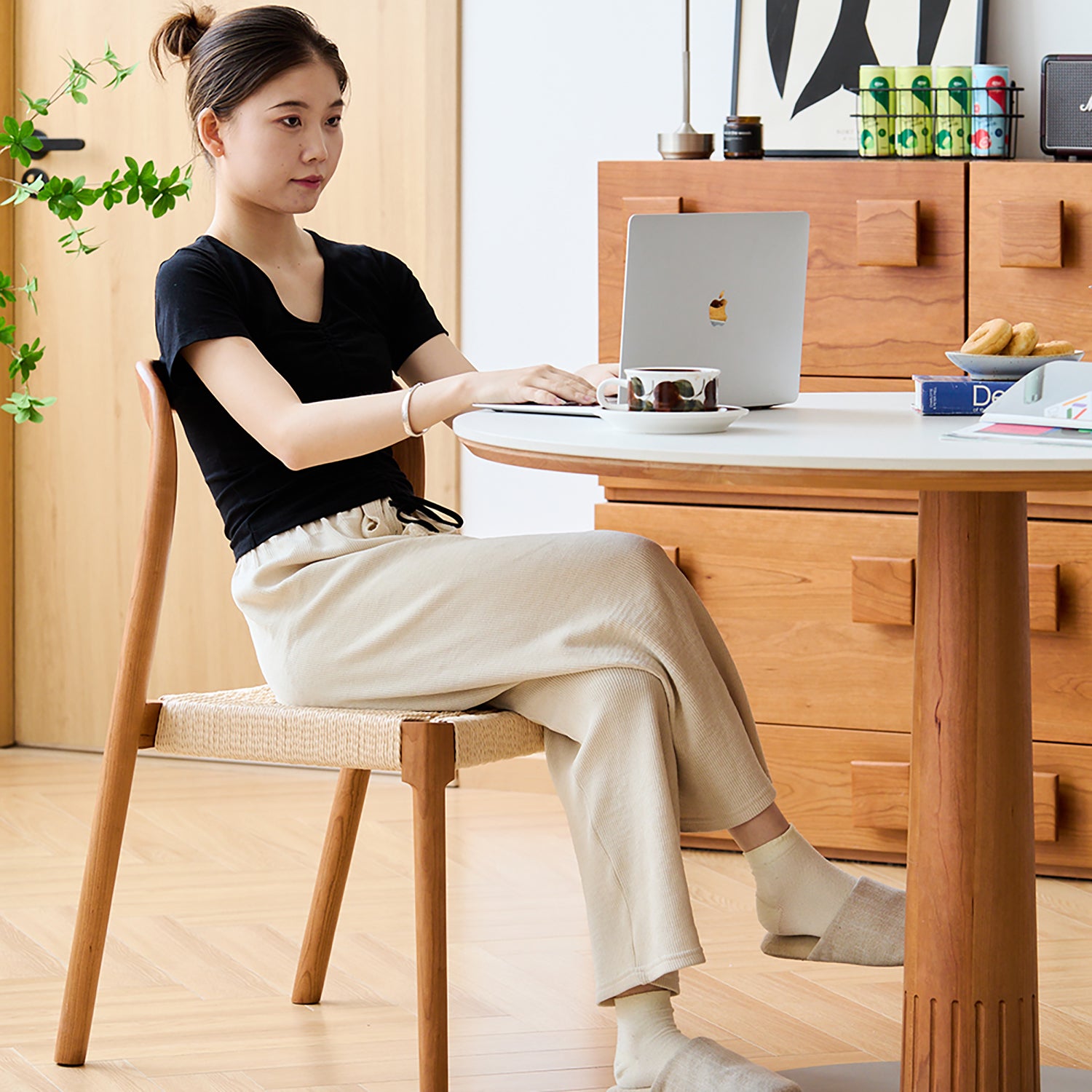 Scandinavian Cherry Wood Woven Rope Dining Chair SONA combines warm cherry wood with breathable woven seating, offering natural comfort and timeless Scandinavian style for dining spaces.