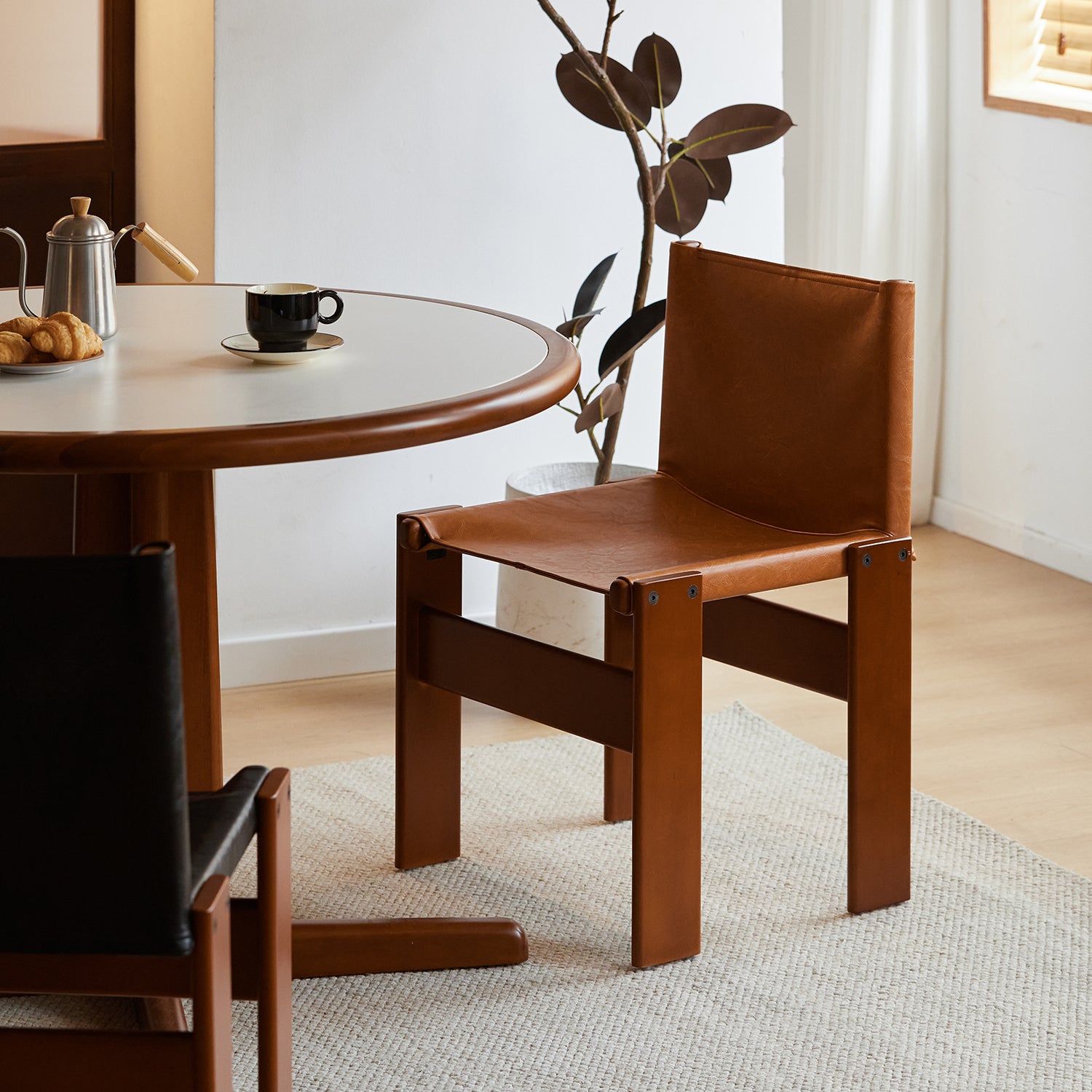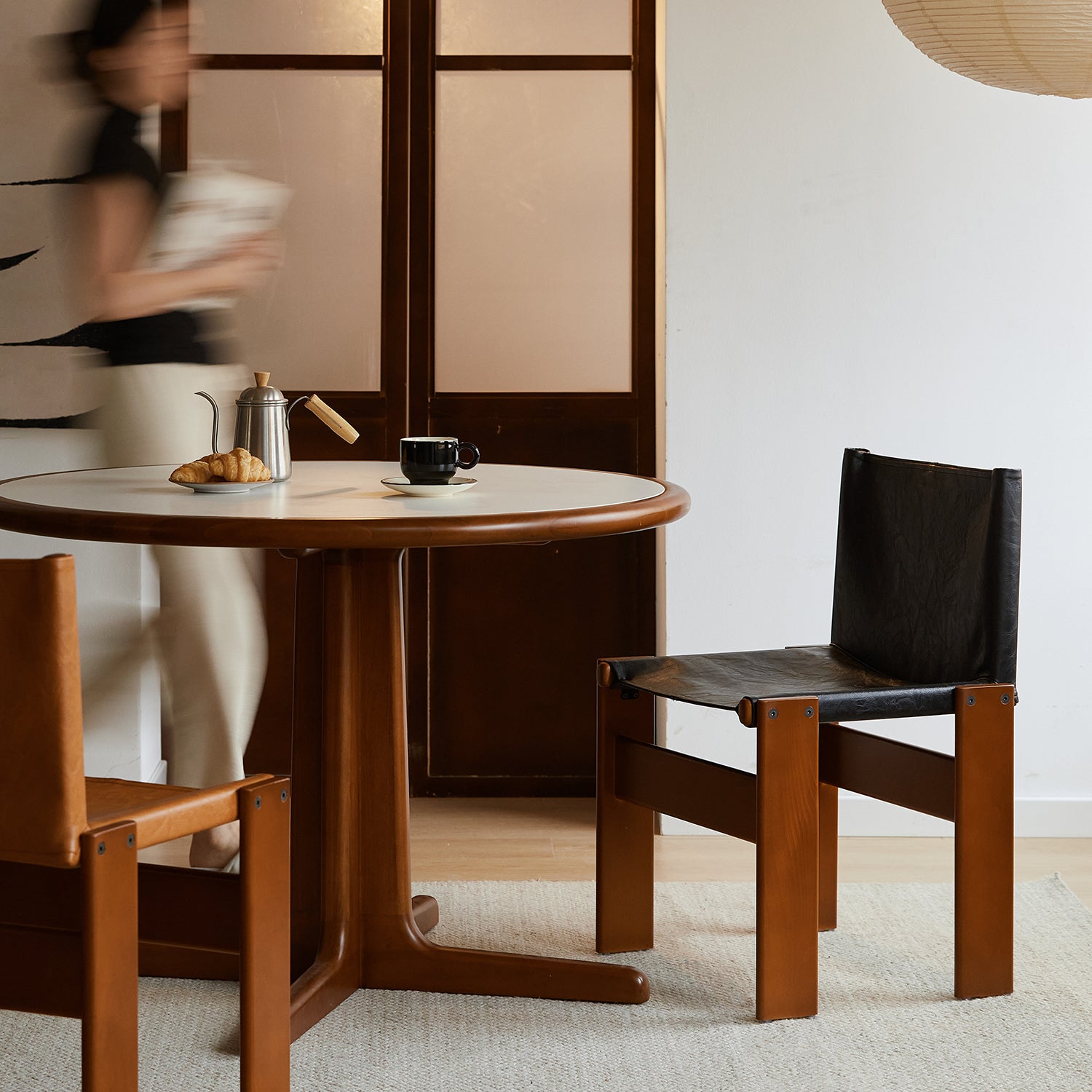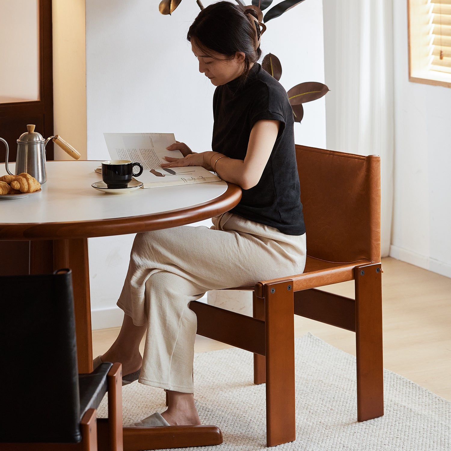 The genuine leather seat with gentle curves provides a comfortable sitting experience while adding timeless sophistication to your dining space. |